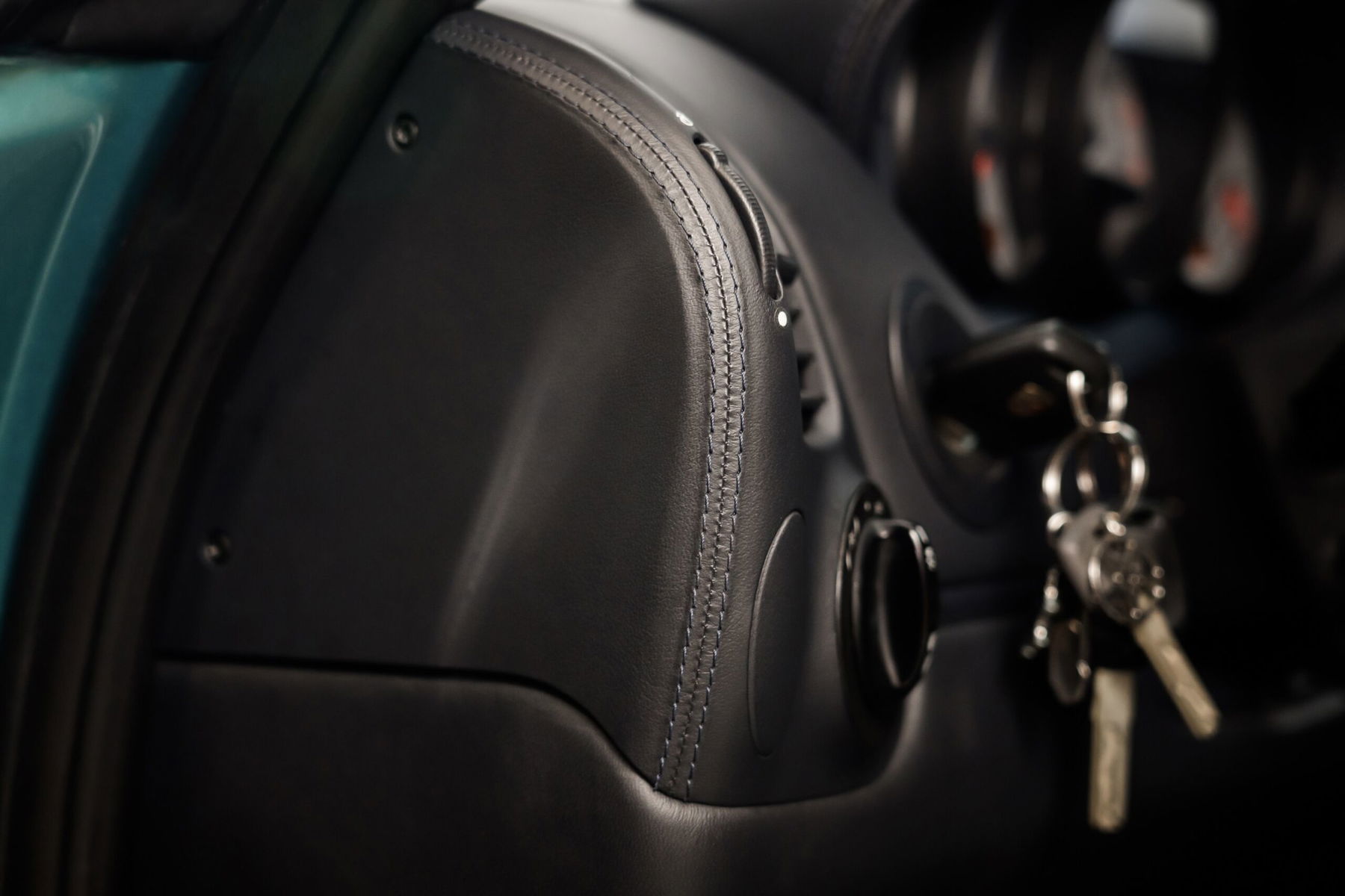 Finished in Wimbledon Green Metallic (Factory color for 2001) with Metropole Blue interior. Professional color change in spring 2025 from Arctic Silver.
