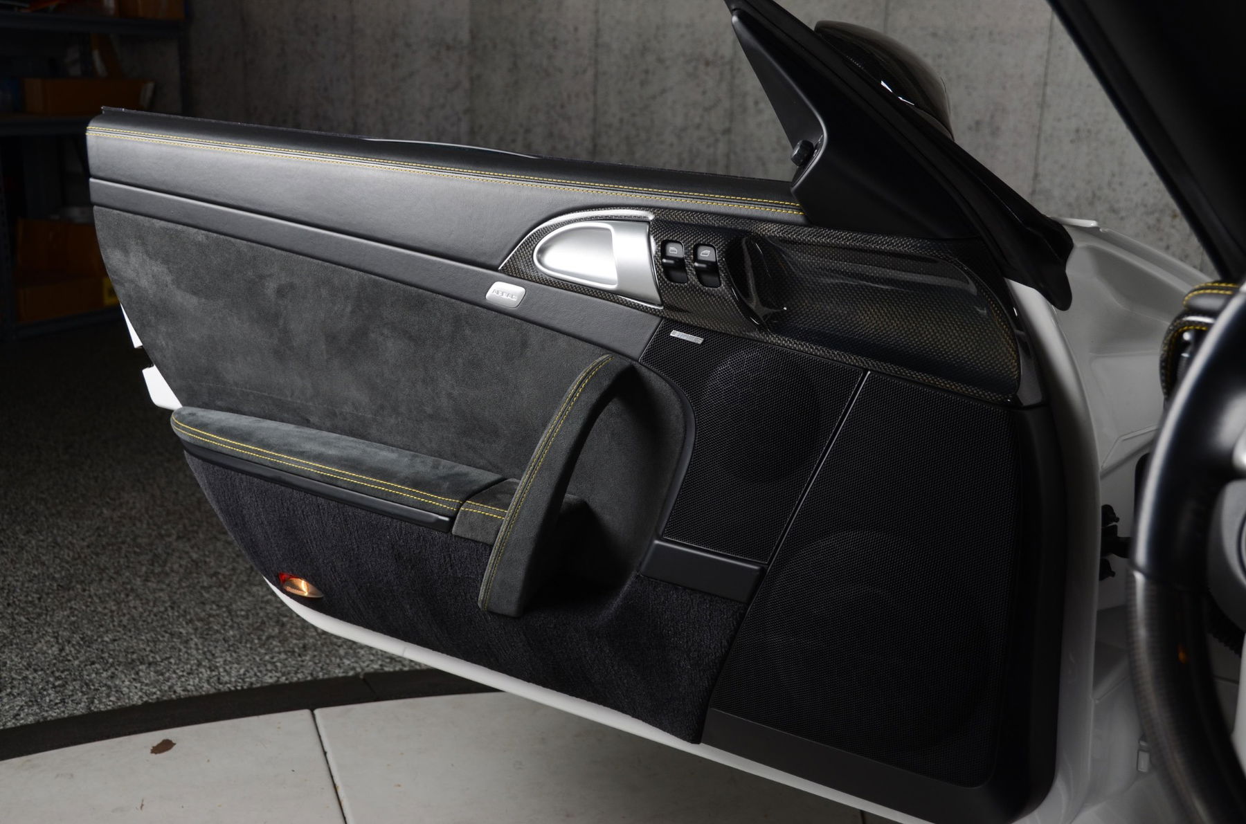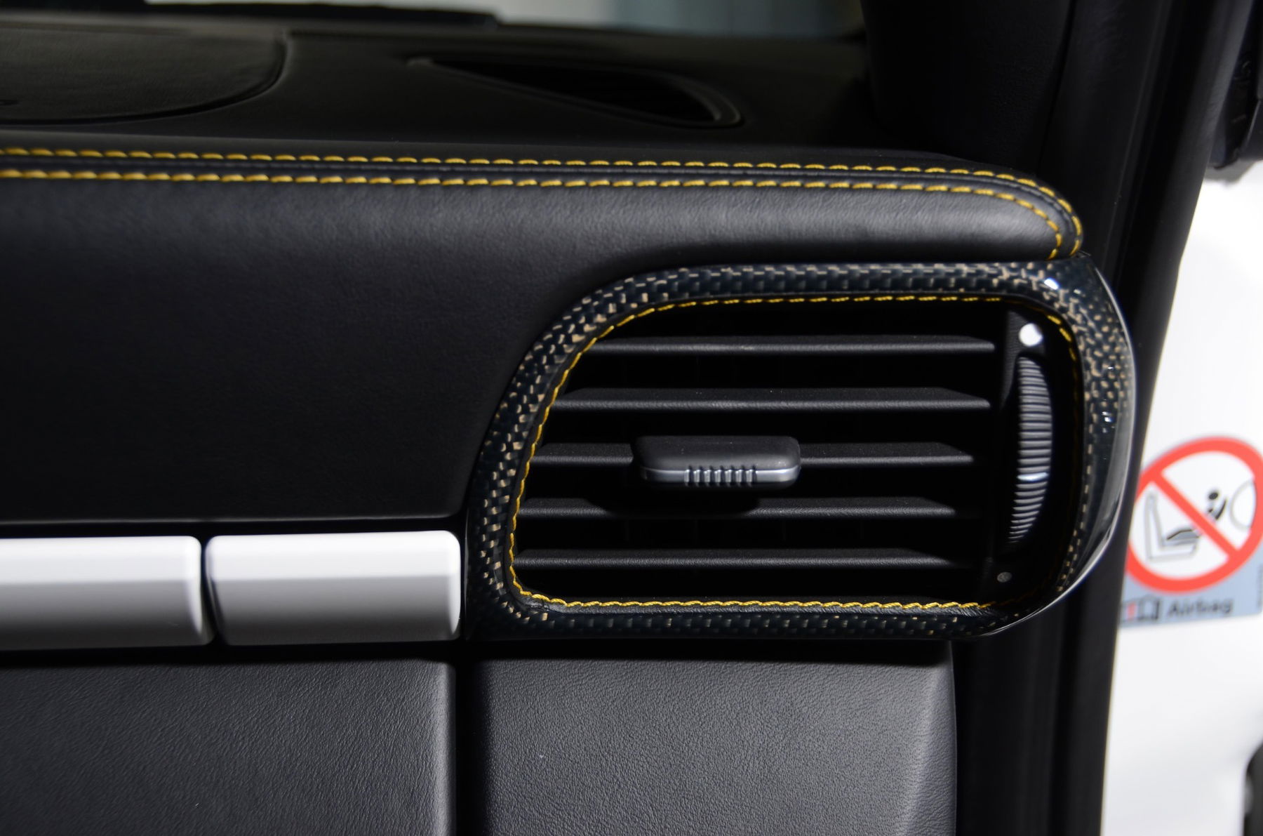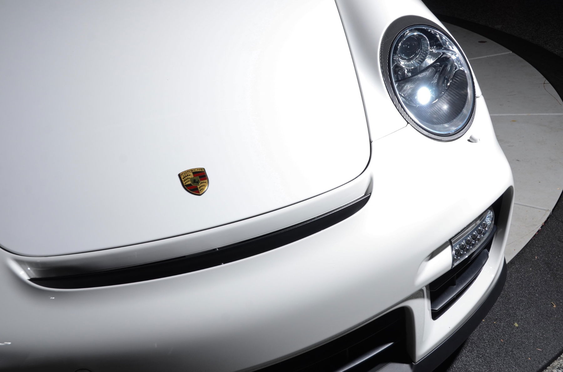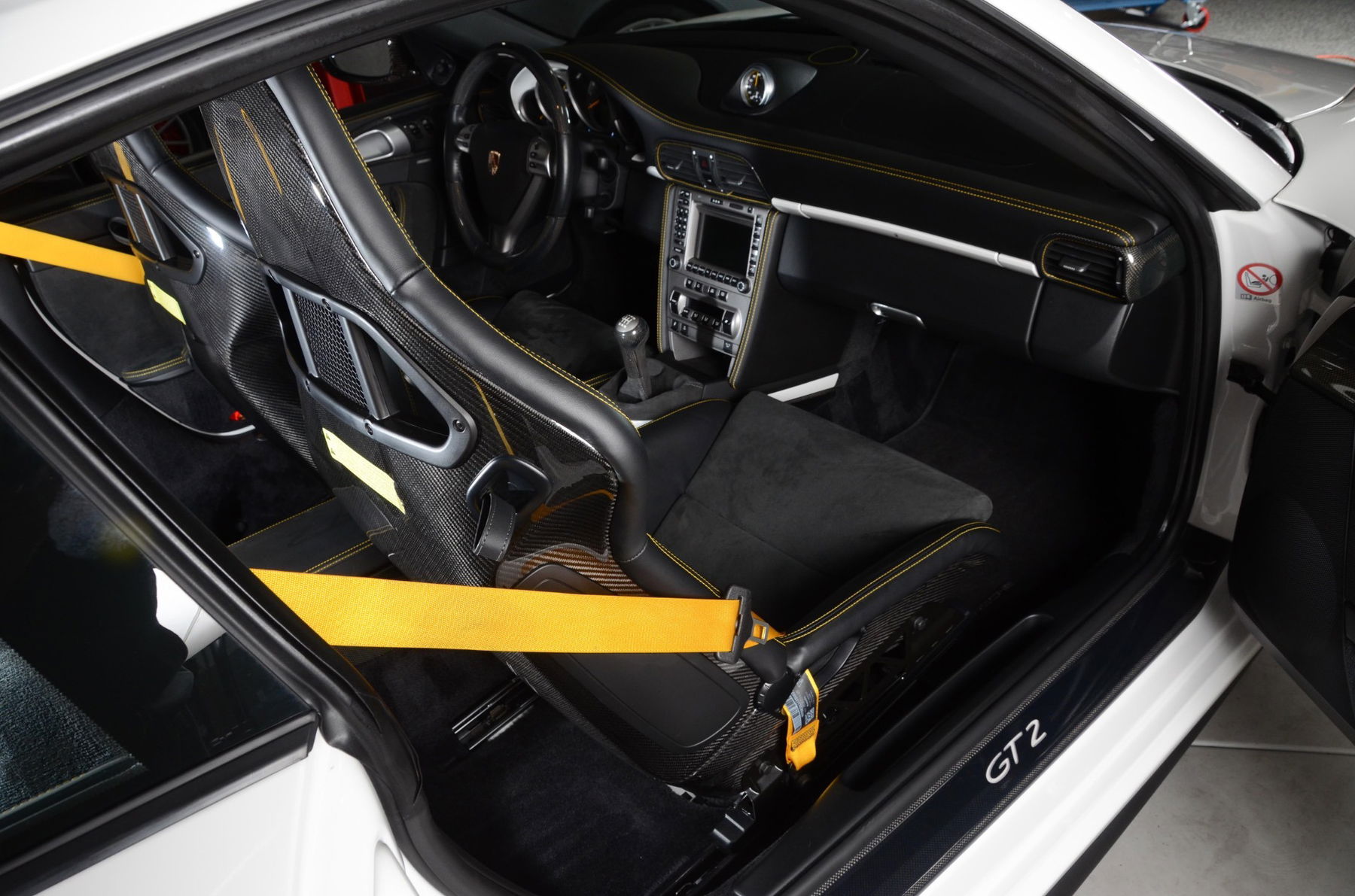 showcased on the 997 gt2 generation’s signature 19-inch multi-spoke wheels in black and displayed against yellow brake calipers of the renowned pccb setup, with a body finished in carrara white, mirror housings featuring carbon fiber surrounds, a rear end characterized by red tail lights, while the black full leather-lined cabin is visually elevated by speed yellow seat belts, a carrara white finished instrumentation surround, shift-boot surround, and dashboard trim strip, yellow stitch-work, and carbon fiber trim and alcantara upholstery on select areas.