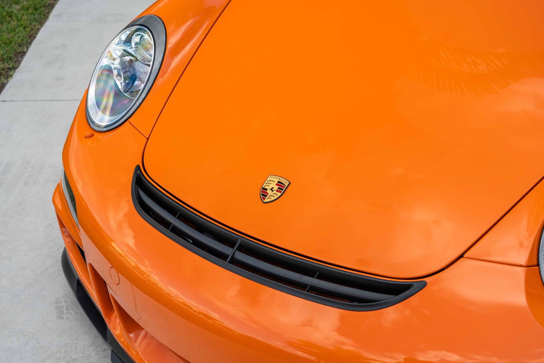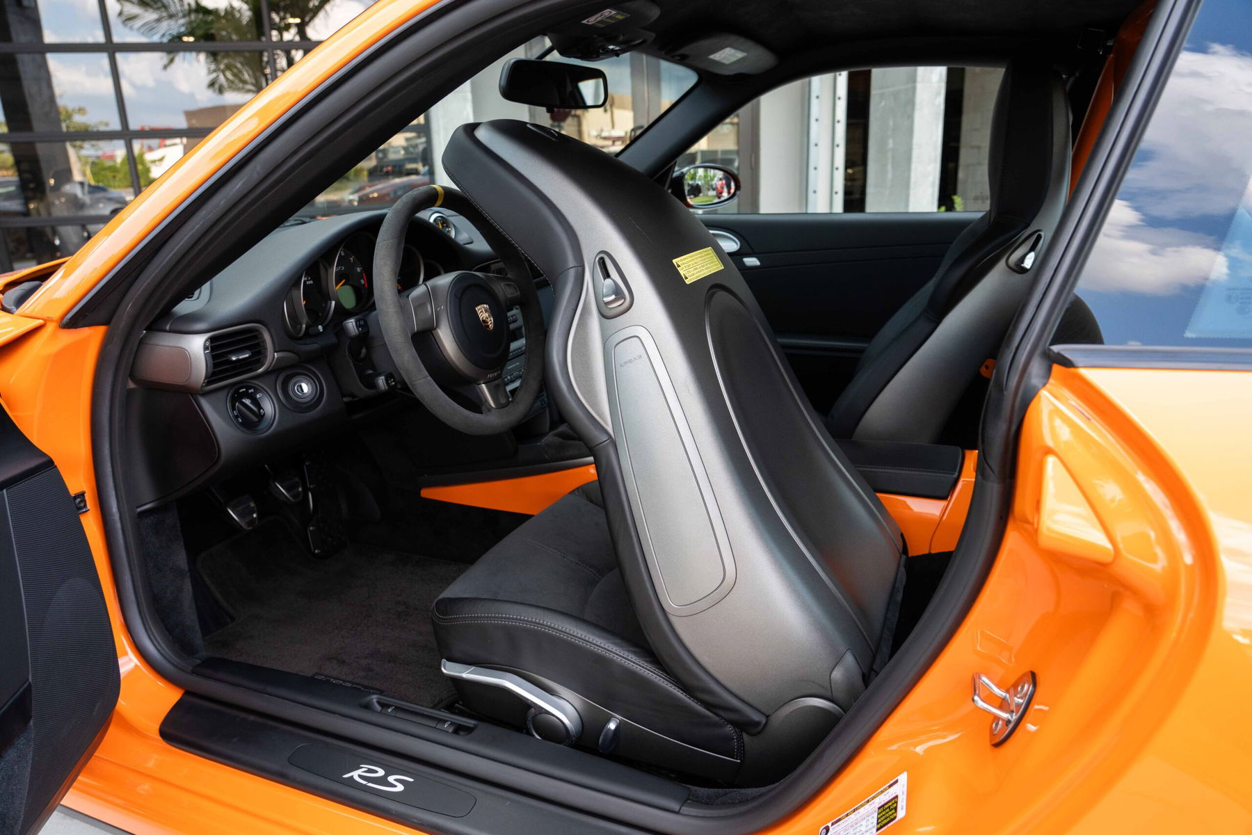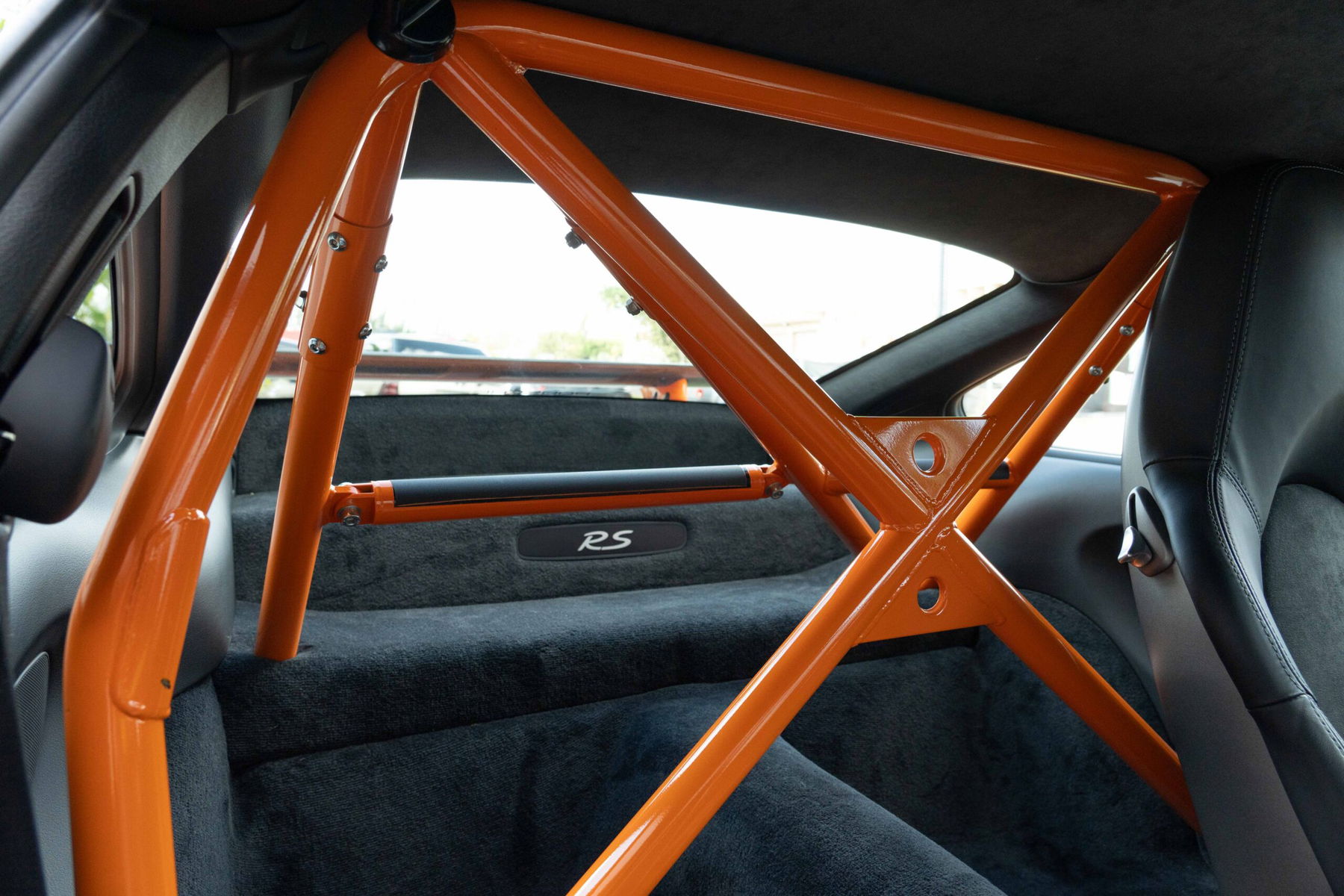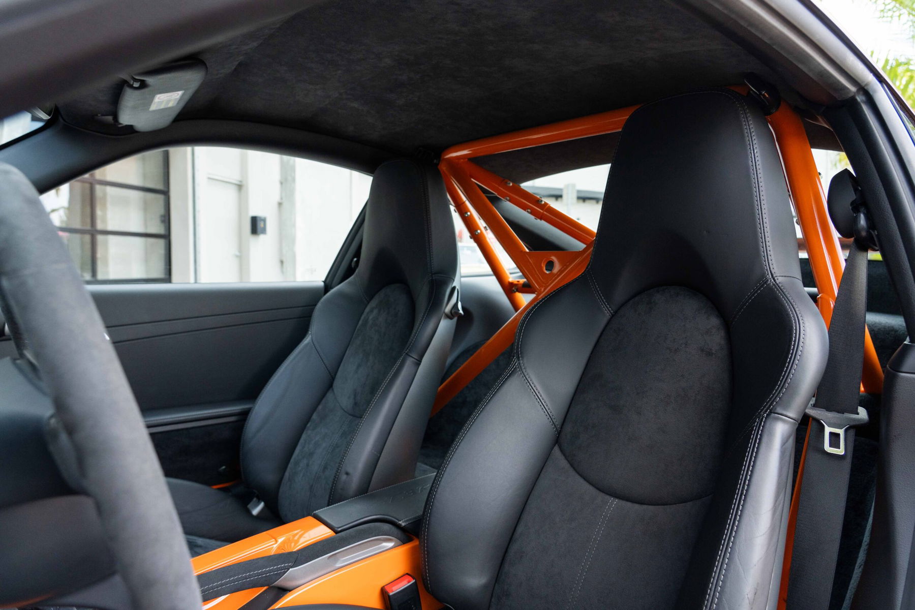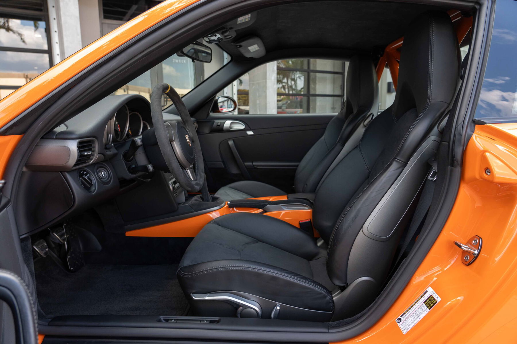 Finished in iconic Orange with black graphics over Black leather, this 997.1 GT3 RS shows just 9k miles and is equipped with sought-after options including Porsche Ceramic Composite Brakes (PCCB), Chrono Package, Bi-Xenon headlamps, and painted rear center console. Additonally, this RS has a paint-matched Orange roll bar.