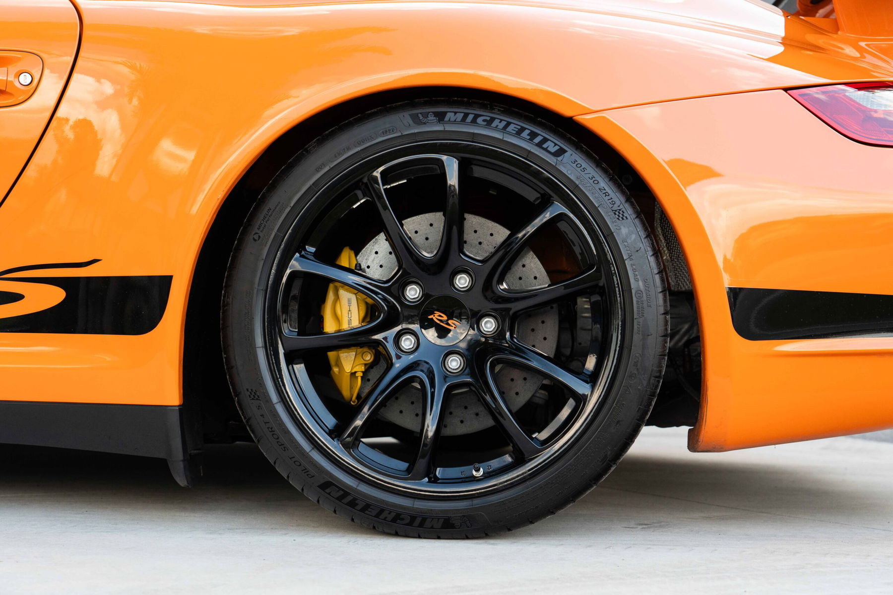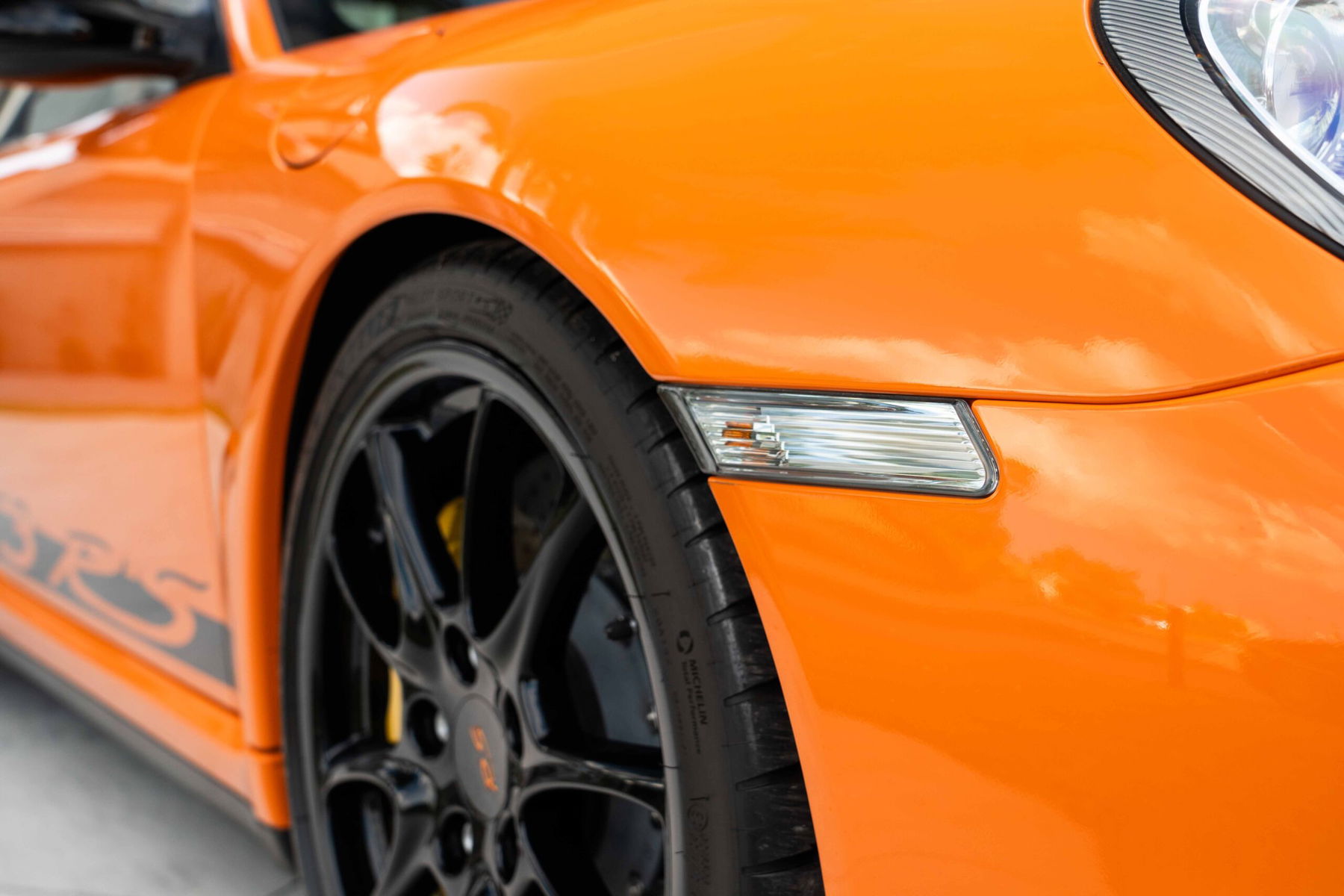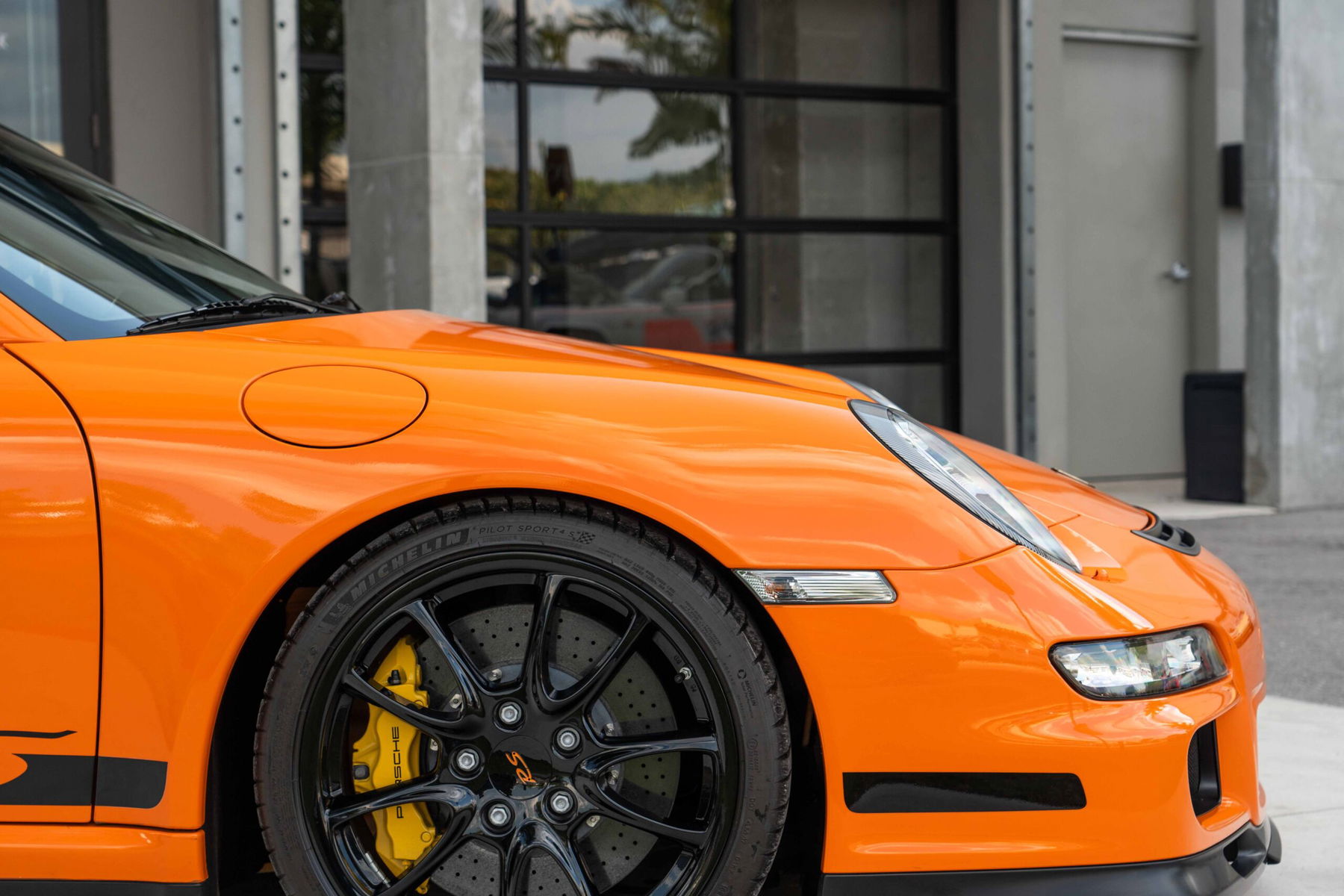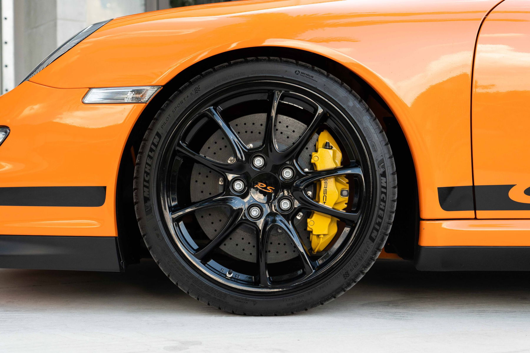 Finished in iconic Orange with black graphics over Black leather, this 997.1 GT3 RS shows just 9k miles and is equipped with sought-after options including Porsche Ceramic Composite Brakes (PCCB), Chrono Package, Bi-Xenon headlamps, and painted rear center console. Additonally, this RS has a paint-matched Orange roll bar.