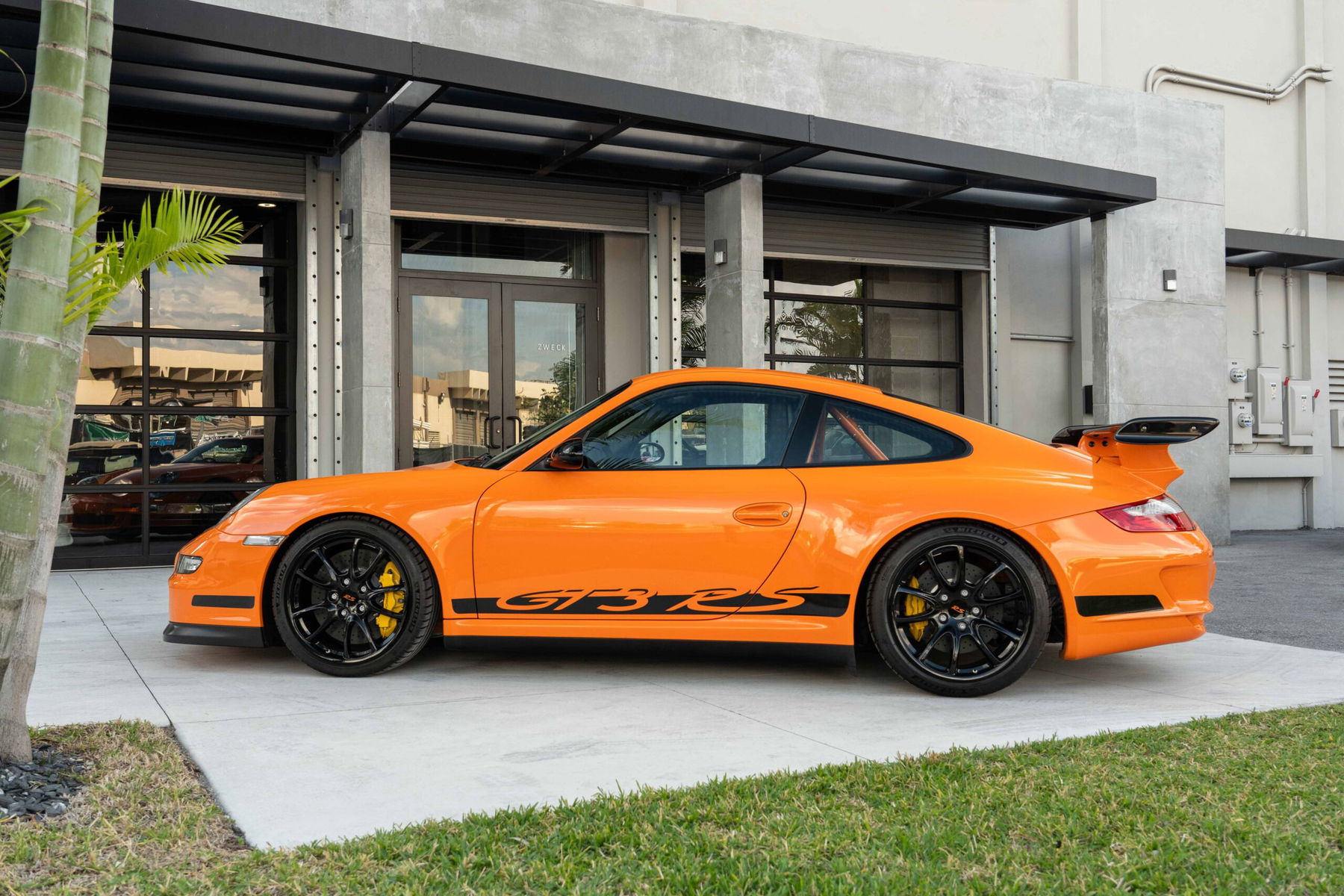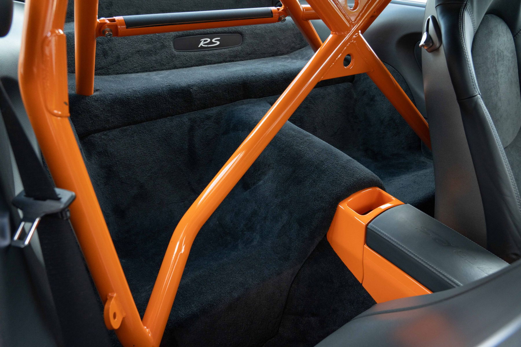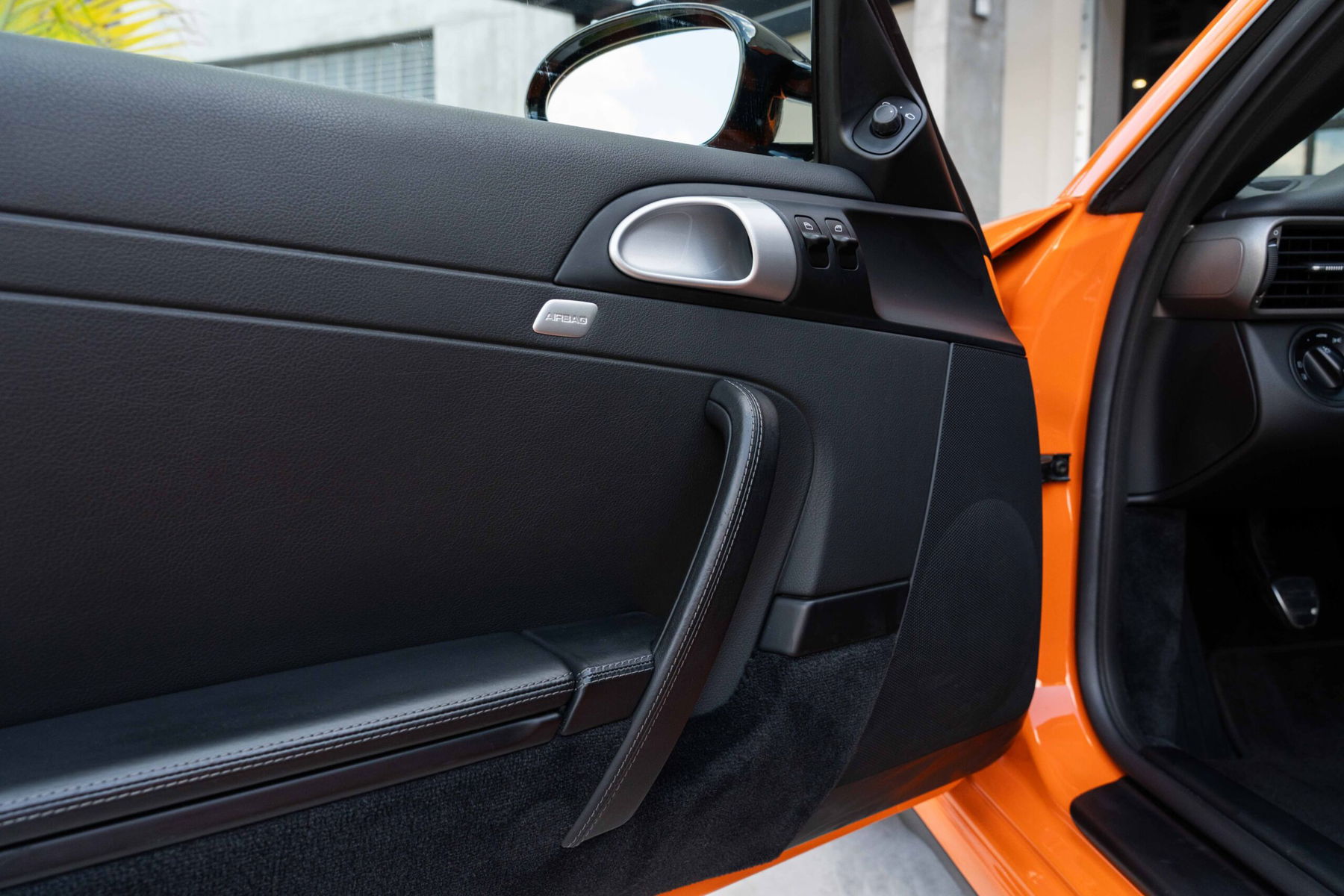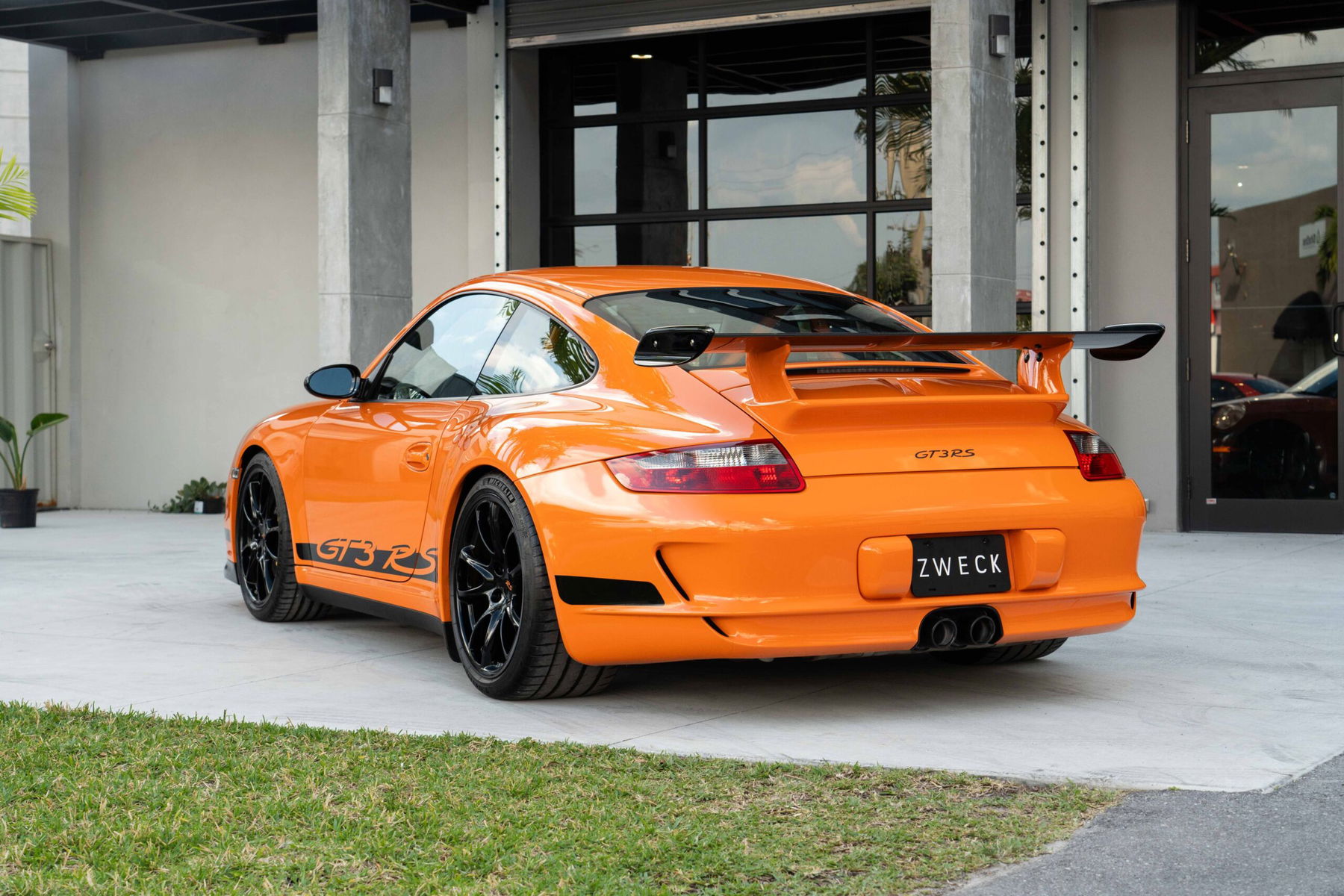 Finished in iconic Orange with black graphics over Black leather, this 997.1 GT3 RS shows just 9k miles and is equipped with sought-after options including Porsche Ceramic Composite Brakes (PCCB), Chrono Package, Bi-Xenon headlamps, and painted rear center console. Additonally, this RS has a paint-matched Orange roll bar.