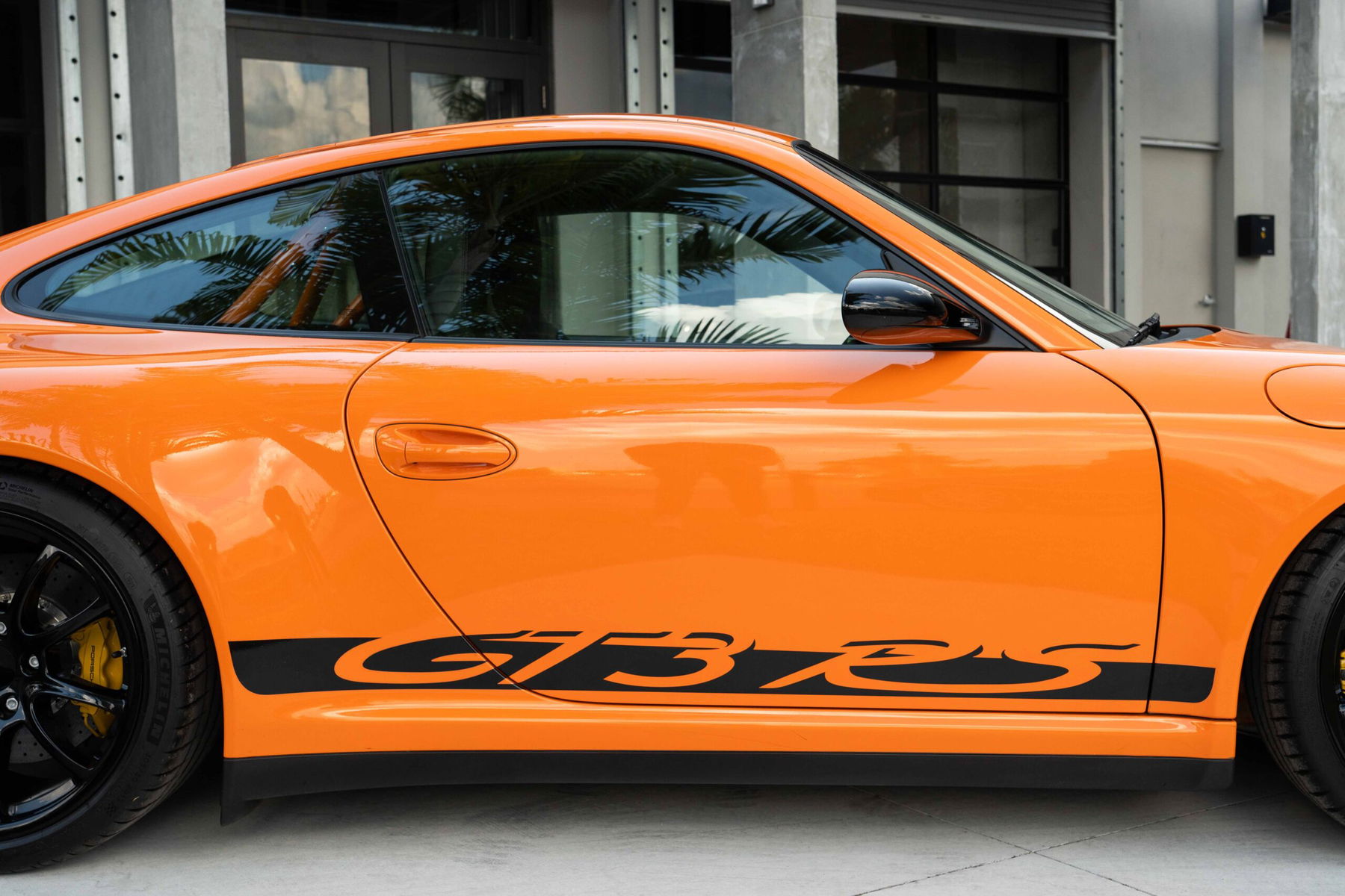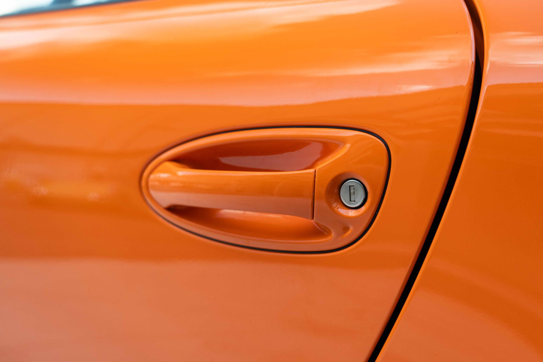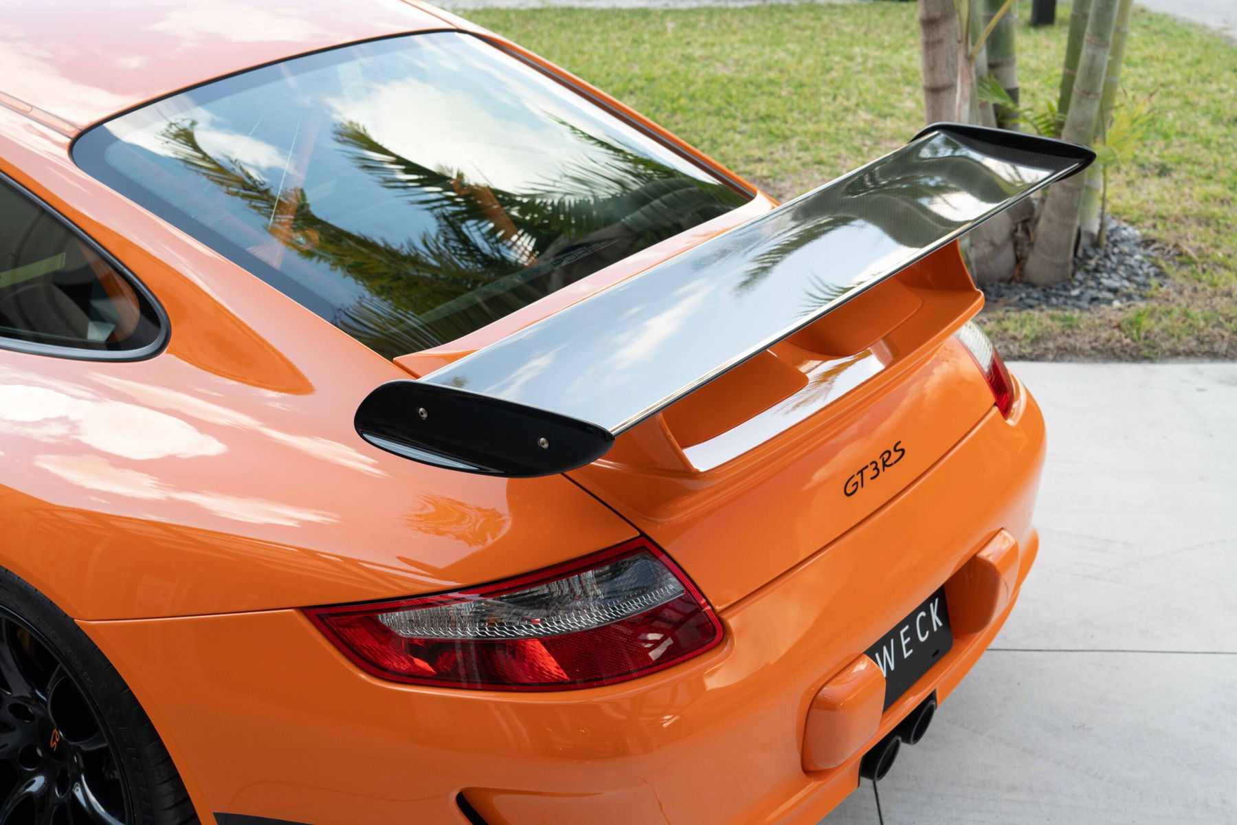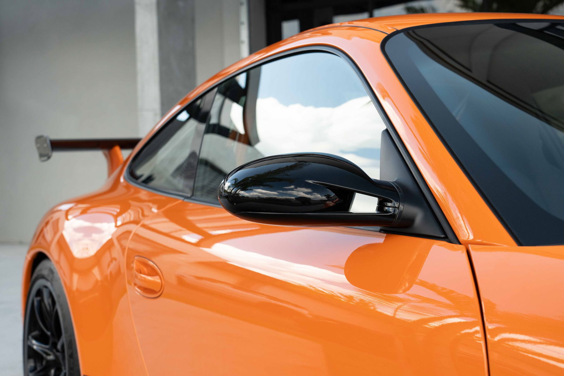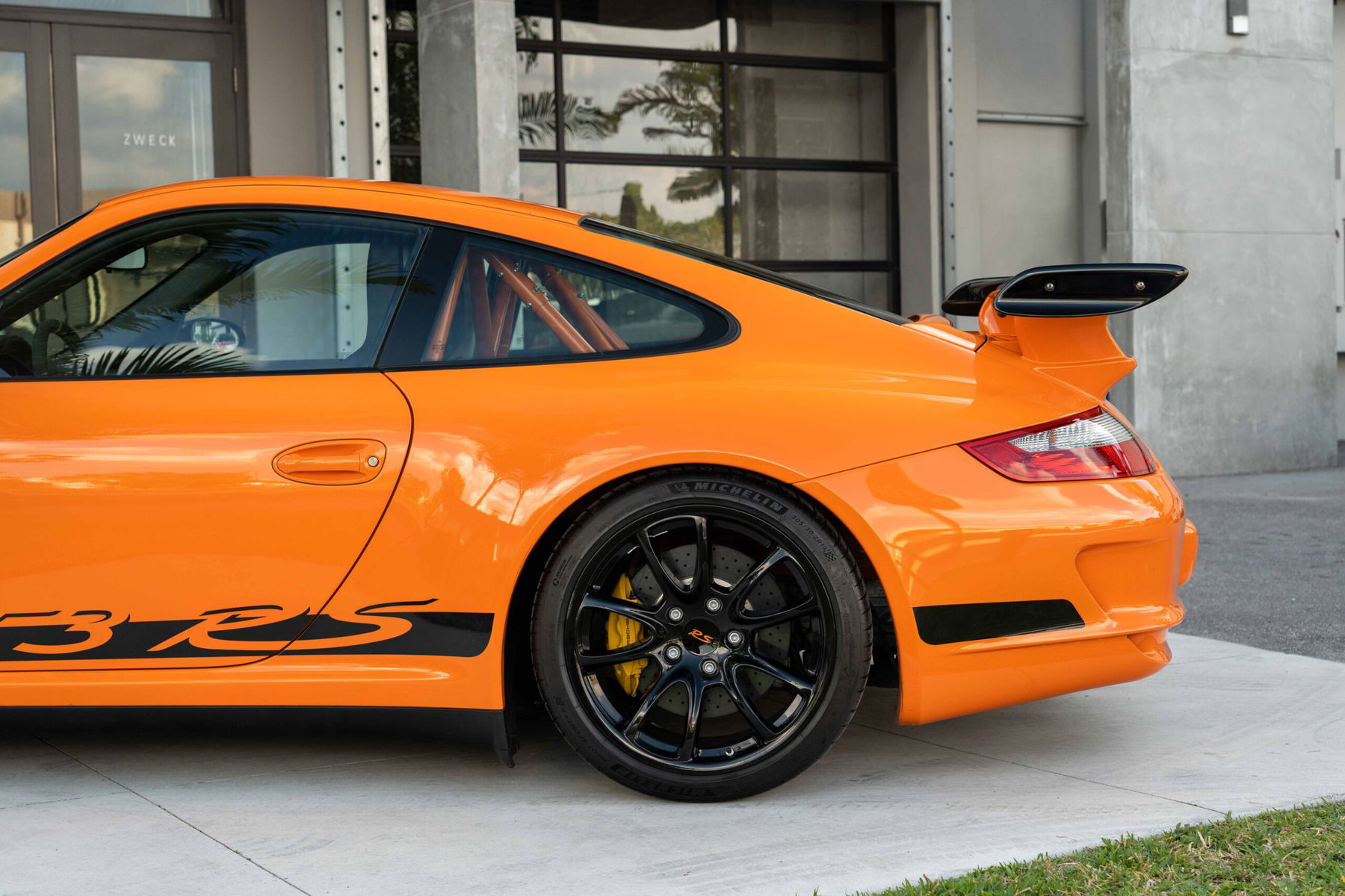 Finished in iconic Orange with black graphics over Black leather, this 997.1 GT3 RS shows just 9k miles and is equipped with sought-after options including Porsche Ceramic Composite Brakes (PCCB), Chrono Package, Bi-Xenon headlamps, and painted rear center console. Additonally, this RS has a paint-matched Orange roll bar.