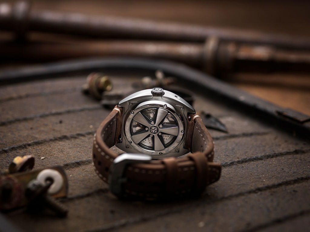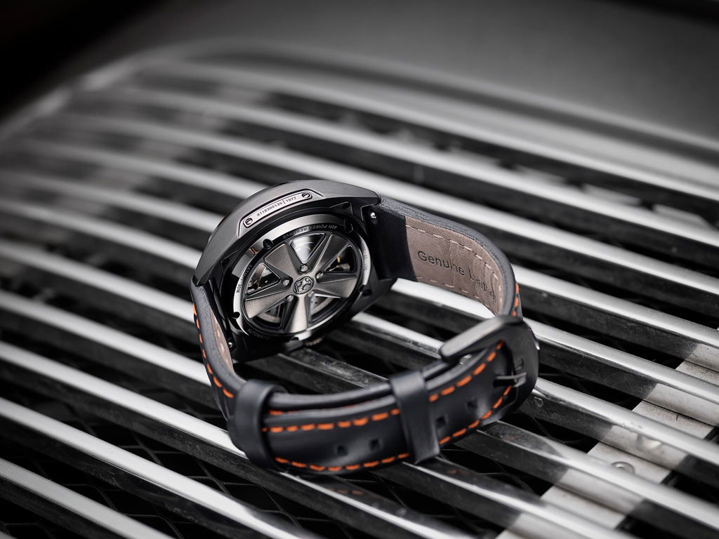 The dial is cut directly from a salvaged Porsche 911 and coated with a gray, semi-transparent lacquer. The special thing about it is that, thanks to the individual patina of the dials, each individual watch produced looks different and each handcrafted piece is unique. This individualization is completed by the FIN number of the donor vehicle being engraved in every watch. The parts of the watch are thus clearly associated with the original vehicle and its history.