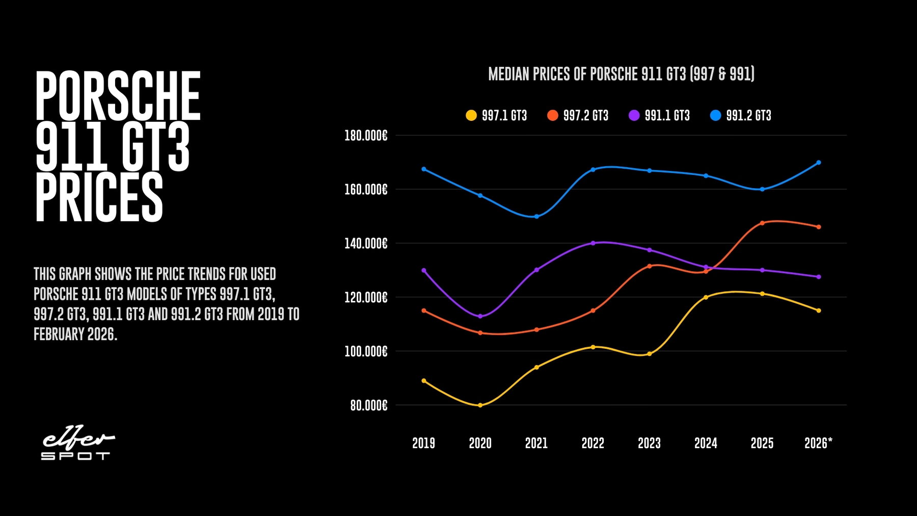 After the great commercial success of the 991.1 GT3, prices on the used market hardly fell at first. Instead, offers were usually relatively close to its sticker price. However, there was a significant dip in 2020. The median price for Porsche 991.1 GT3s fell to just over 110,000 euros. There were plenty of cars on offer below 100,000 euros! By 2022, prices had recovered again towards 140,000 euros, but have fallen by a few thousand euros every year since then. In 2025, the median price was relatively close to 130,000 euros – i.e. very close to the original retail price again. This development is nothing unusual in itself. However, a look at the prices of the predecessors and successors raises questions.
