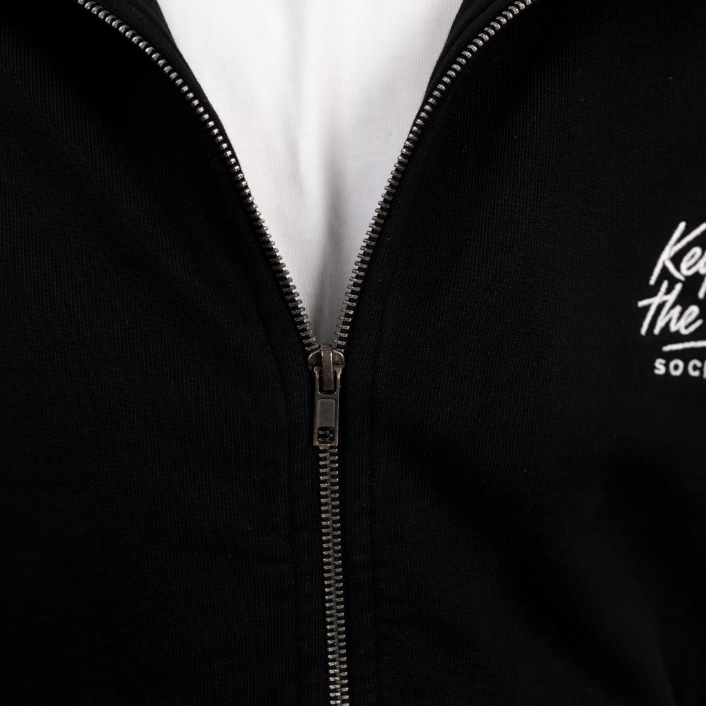 Part of our Key on the left collection – this time with a zipper. Discreet at the front, clear at the back: the finely embroidered Key on the Left Society lettering on the chest and the multi-layered high-density print on the back that leaves no doubt – ignition on the left.