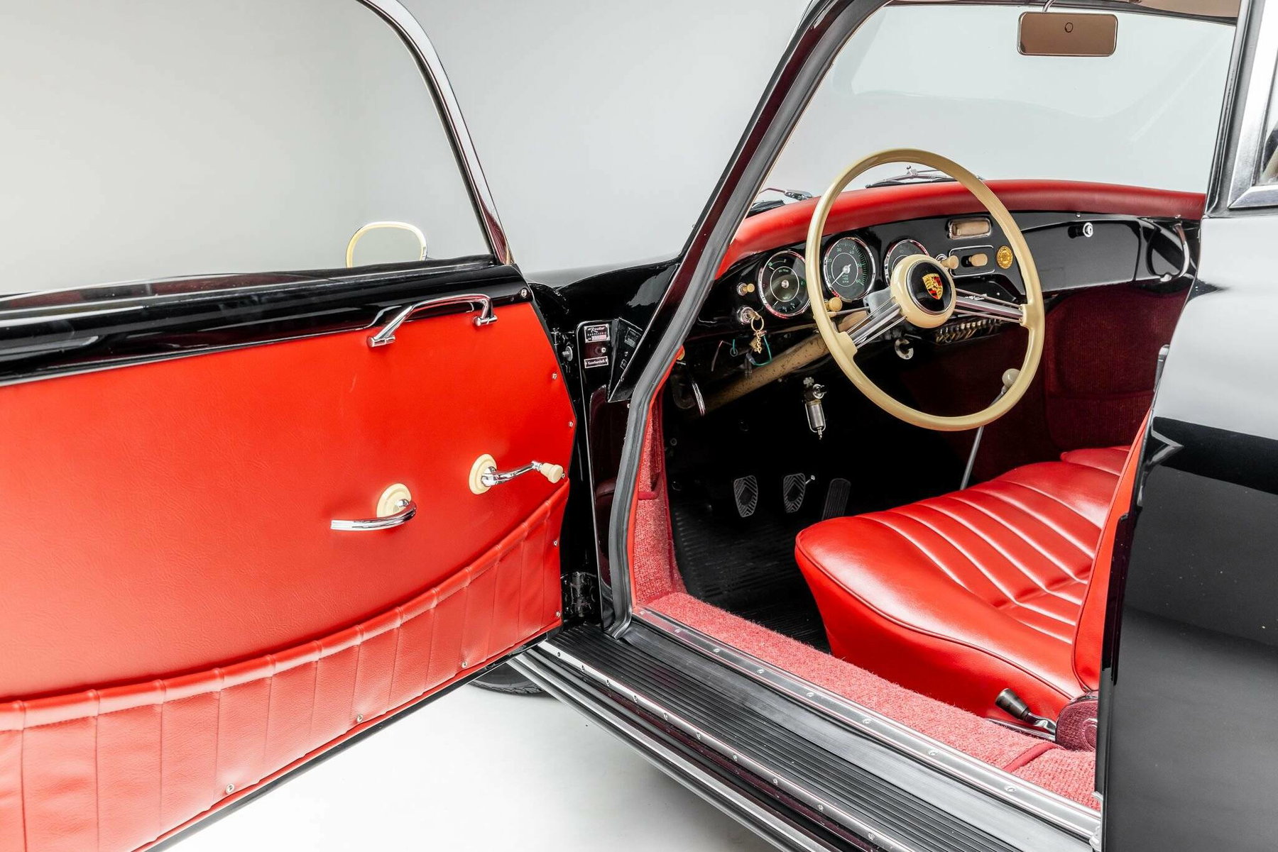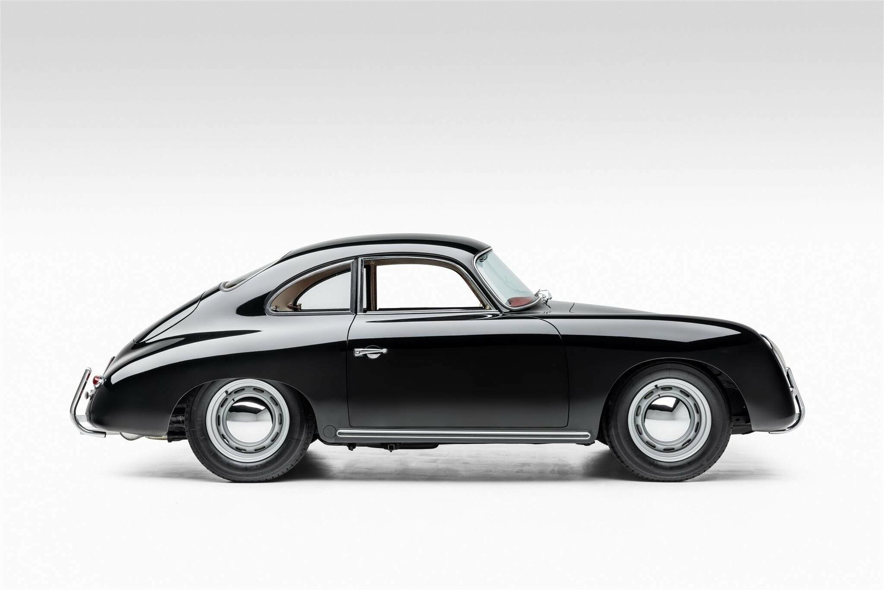 This 1957 Porsche 356A Outlaw Coupe, VIN 101270, is finished in Black with a Red interior, the paint work is stunning with a red leatherette interior and red German square weave carpets. The exterior is complemented by Nerf Bars, ‘Baby Moon’ chrome hubcaps, and a dual Sport exhaust system. Original components include date-coded chrome seat brackets, date-coded fuel tank, date-coded sending unit, and original Lemmerz spare wheel.
