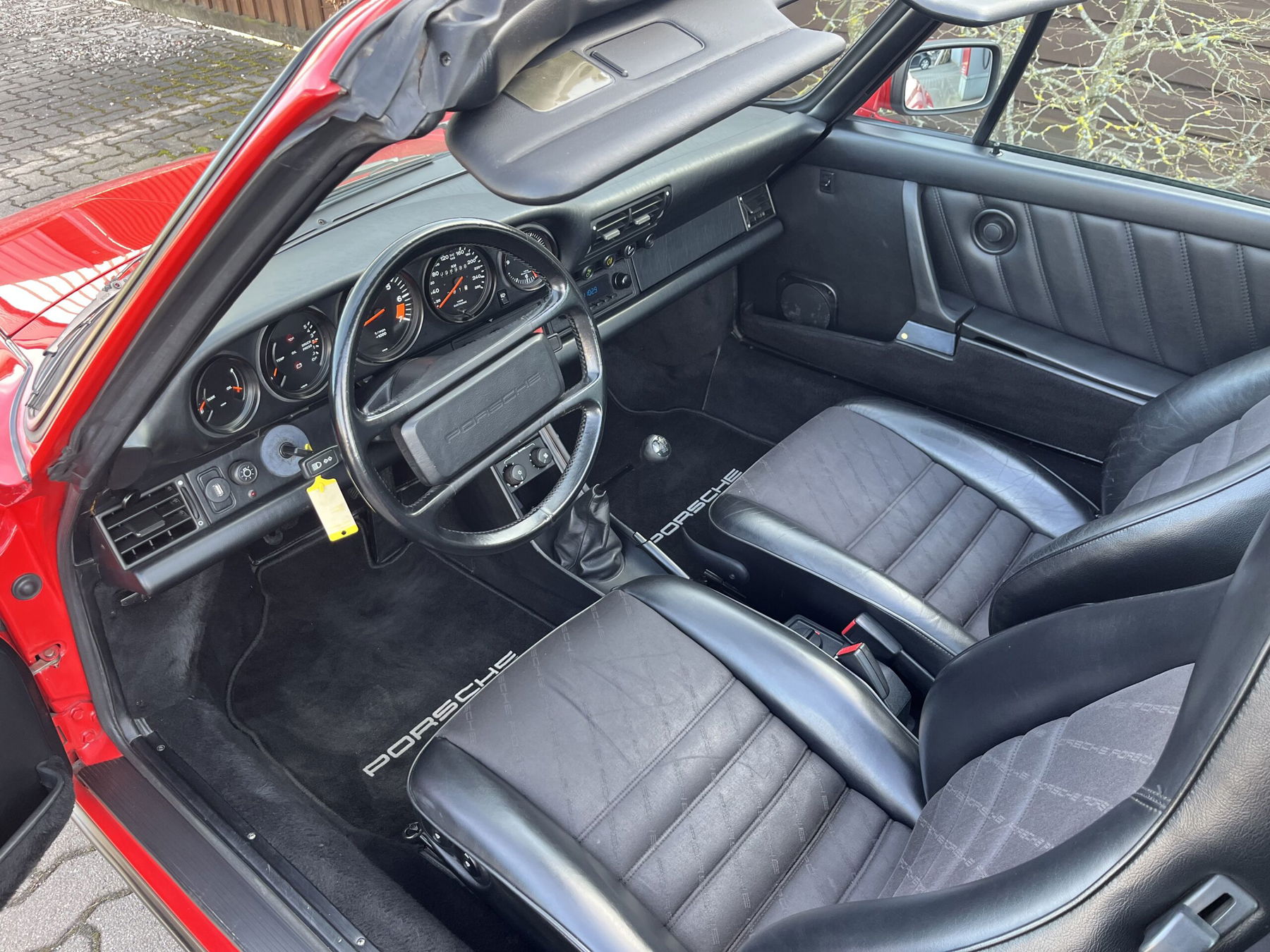 Porsche 911 Carrera Targa 3,2 G-50 en rouge indien avec combinaison tissu/cuir noir. Livrée d'usine à Stuttgart. Immatriculation H, en décembre 2025, 10 156 € ont été investis dans la voiture (entre autres, entretien/embrayage/pneus Michelin/étriers de frein remplacés). La facture est disponible et peut être envoyée sur demande, tout comme une vidéo du véhicule via WhatsApp. Carnet d'entretien d'origine disponible. Nous sommes actuellement en train de remplacer la housse du toit Targa et de réviser les joints du toit Targa. Véhicule haut de gamme dans une combinaison de couleurs classique et avec un historique traçable, depuis 13 ans dans sa 3e main.