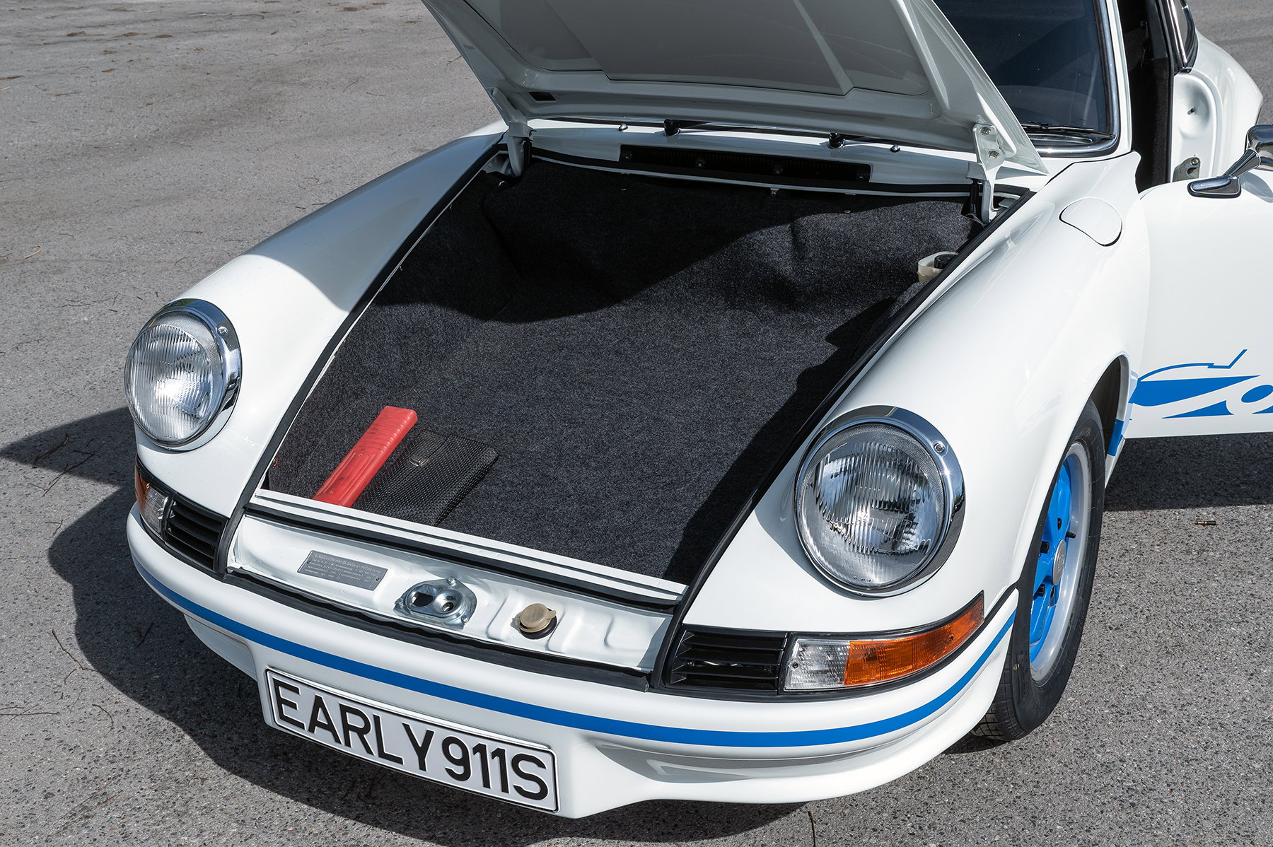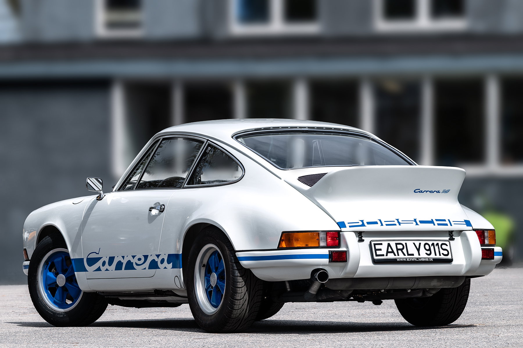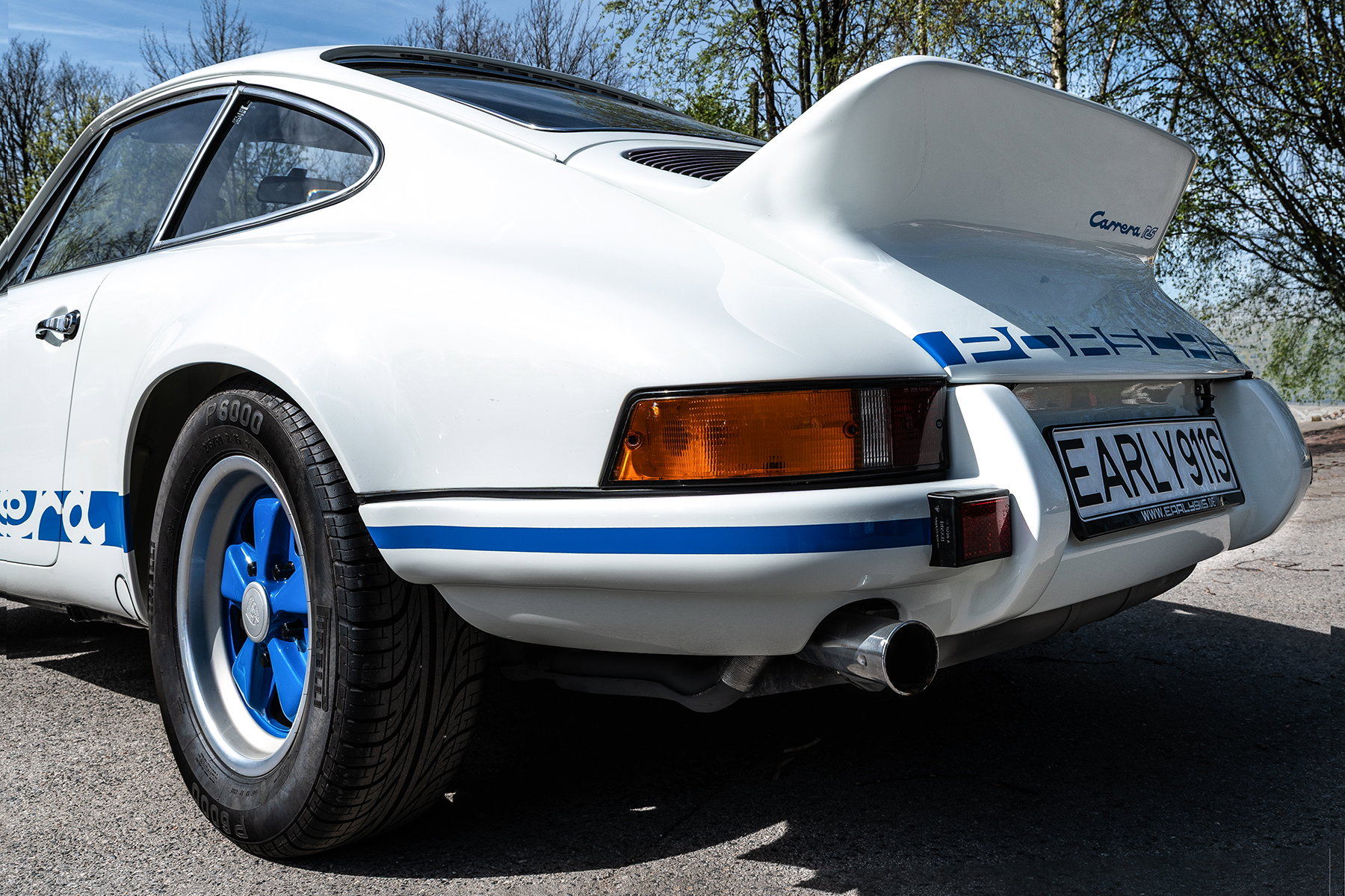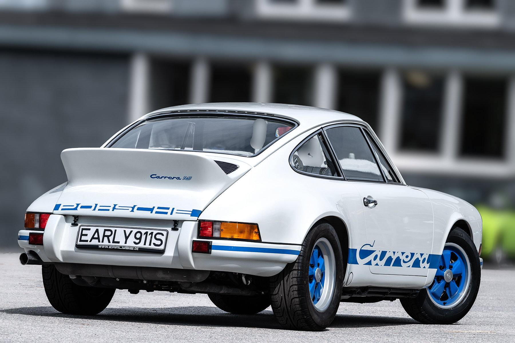 Cette Porsche 911 2,7 Carrera RS Leichtbau, de couleur blanc Grand Prix et équipée de sièges sport noirs, a été entièrement restaurée dans le respect de l'original.