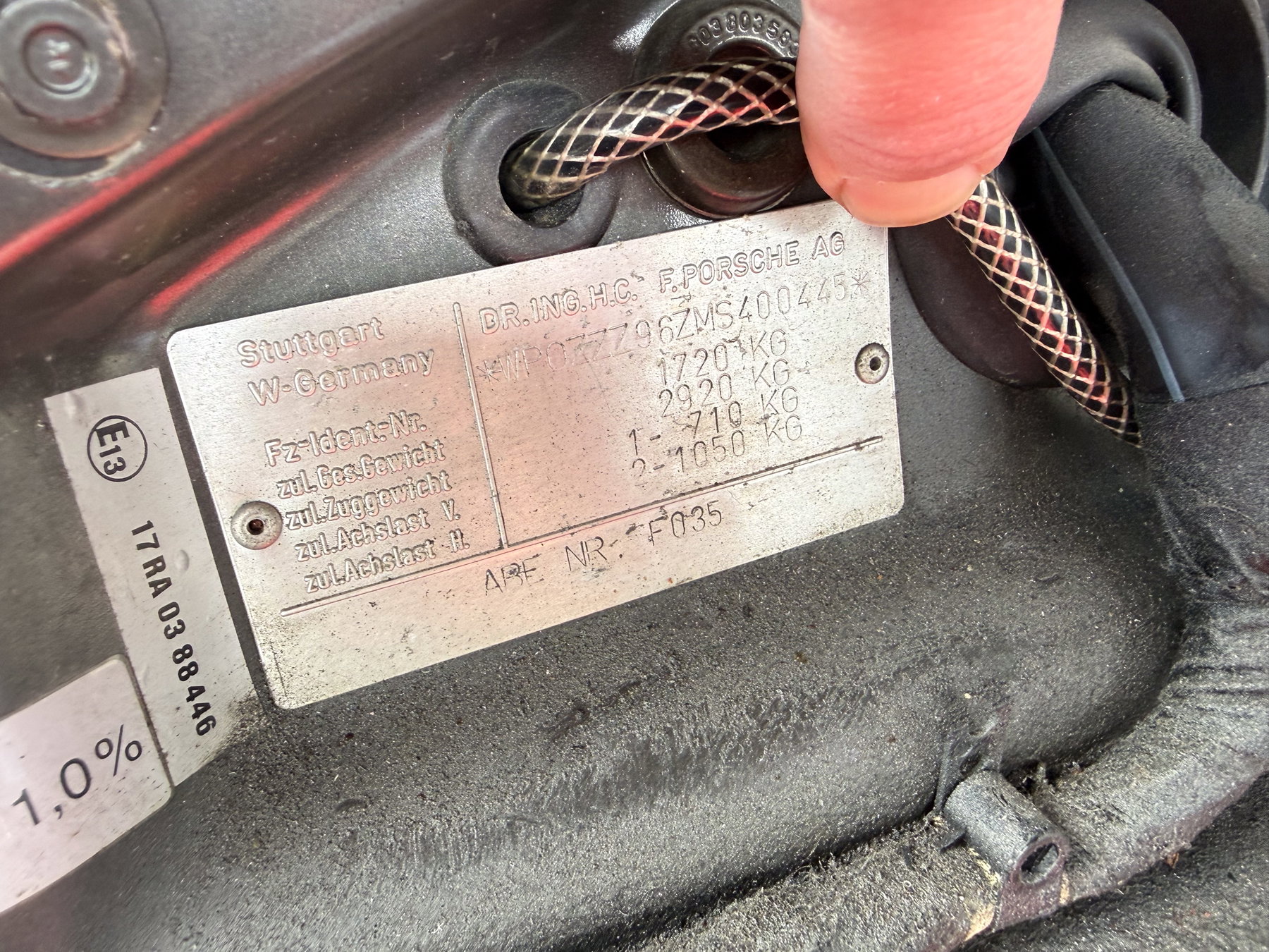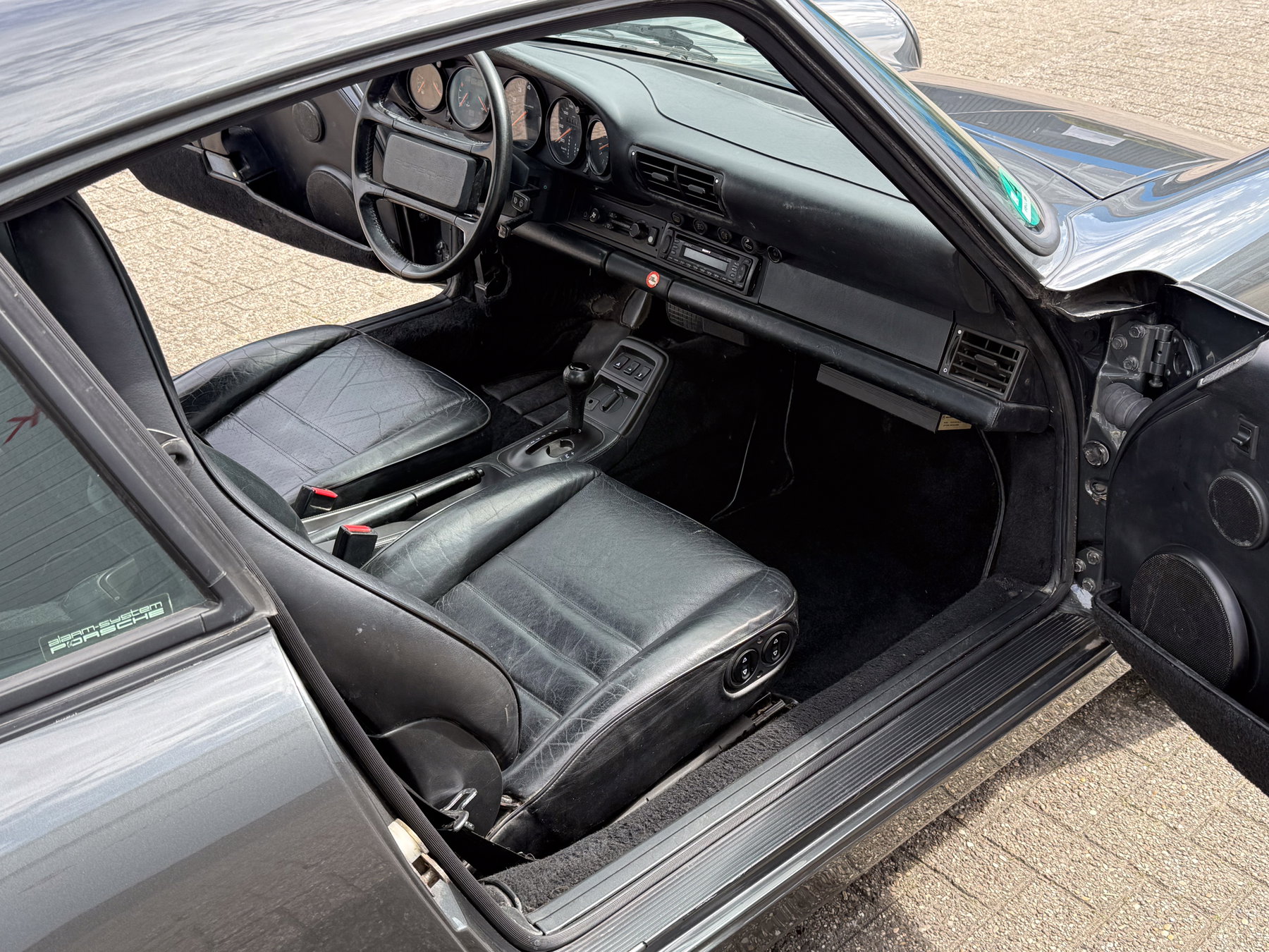 Contrôle technique allemand (TÜV) valide jusqu'en mai 2027. Kilométrage affiché : 408 930 km. Première immatriculation en Allemagne (C00). Nous avons importé la voiture aux Pays-Bas. Couleur Slate Grey Metallic (L22D) avec intérieur en cuir noir. Autocollants d'options et de couleur encore présents dans le coffre. Le moteur est « matching numbers » avec la voiture (code moteur 62M).