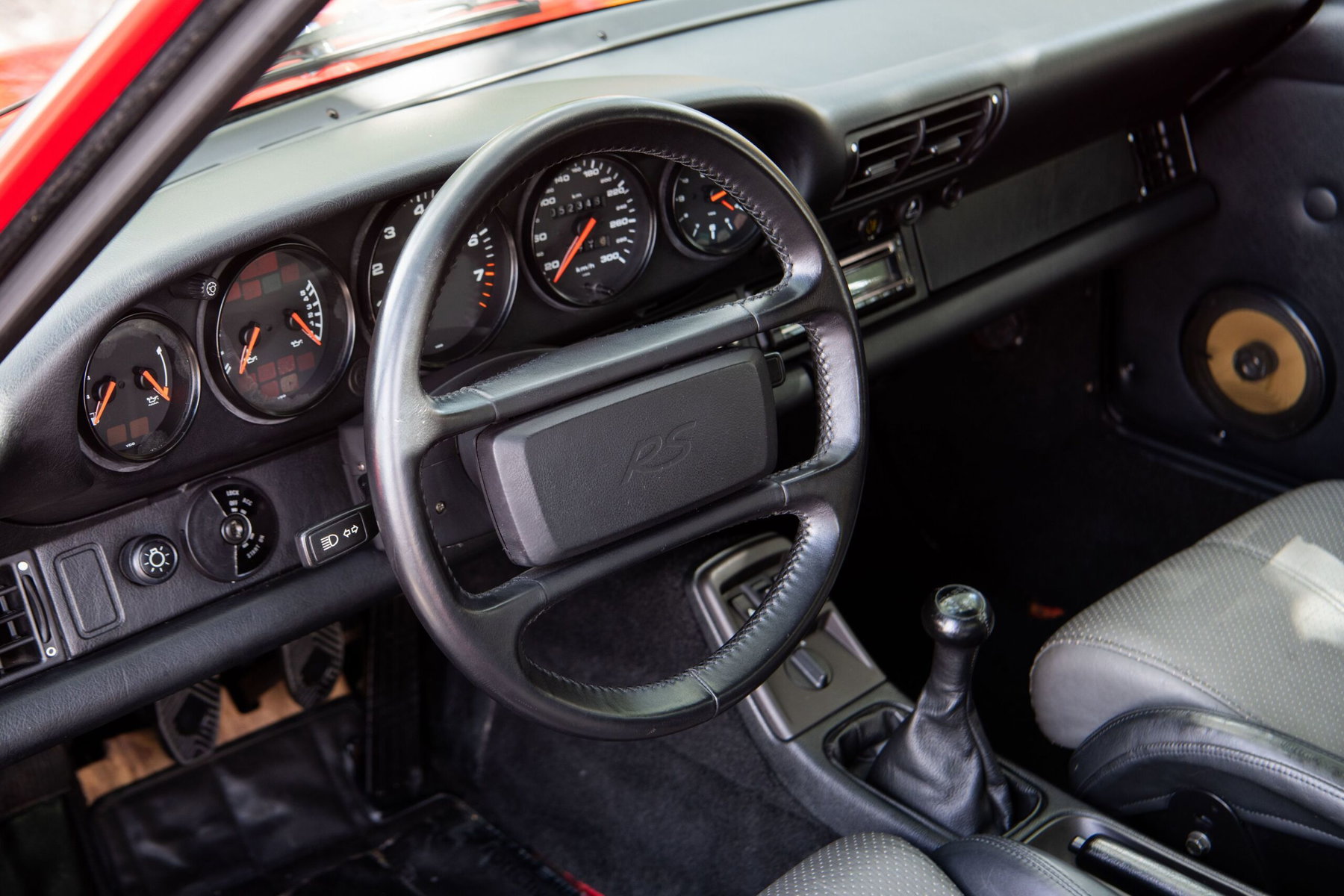 L'habitacle dépouillé, équipé de sièges baquets Recaro d'origine et de panneaux de porte minimalistes dotés de sangles de déverrouillage, témoigne des efforts déployés pour créer une RS de route axée sur la compétition, en n'offrant que l'essentiel pour une expérience purement centrée sur le conducteur. À l'image de son extérieur, l'habitacle est en excellent état, ne présentant qu'une usure minime au niveau du renfort du siège conducteur, et est par ailleurs magnifiquement bien entretenu. Les ceintures de sécurité rouges apportent une touche élégante qui s'harmonise avec la livrée Guards Red. La voiture est accompagnée de son manuel d'utilisation, d'une trousse à outils, de ses carnets d'entretien, de ses documents d'exportation et d'un certificat de spécifications de production Porsche.