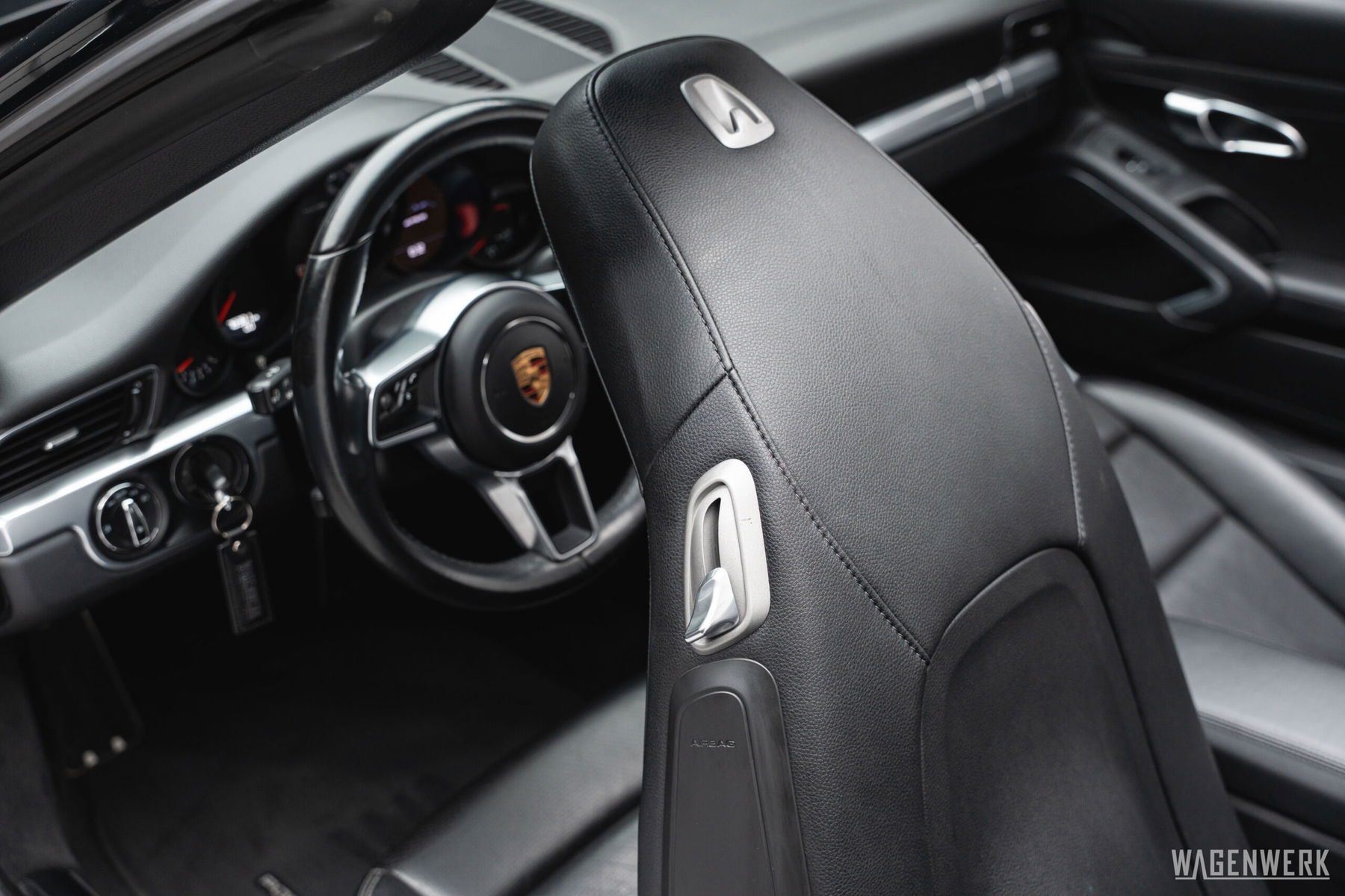 À l’intérieur, ce concept élégant se poursuit sans transition. L’habillage complet en cuir noir incarne cette qualité sans compromis qui fait la renommée de Porsche depuis des décennies.