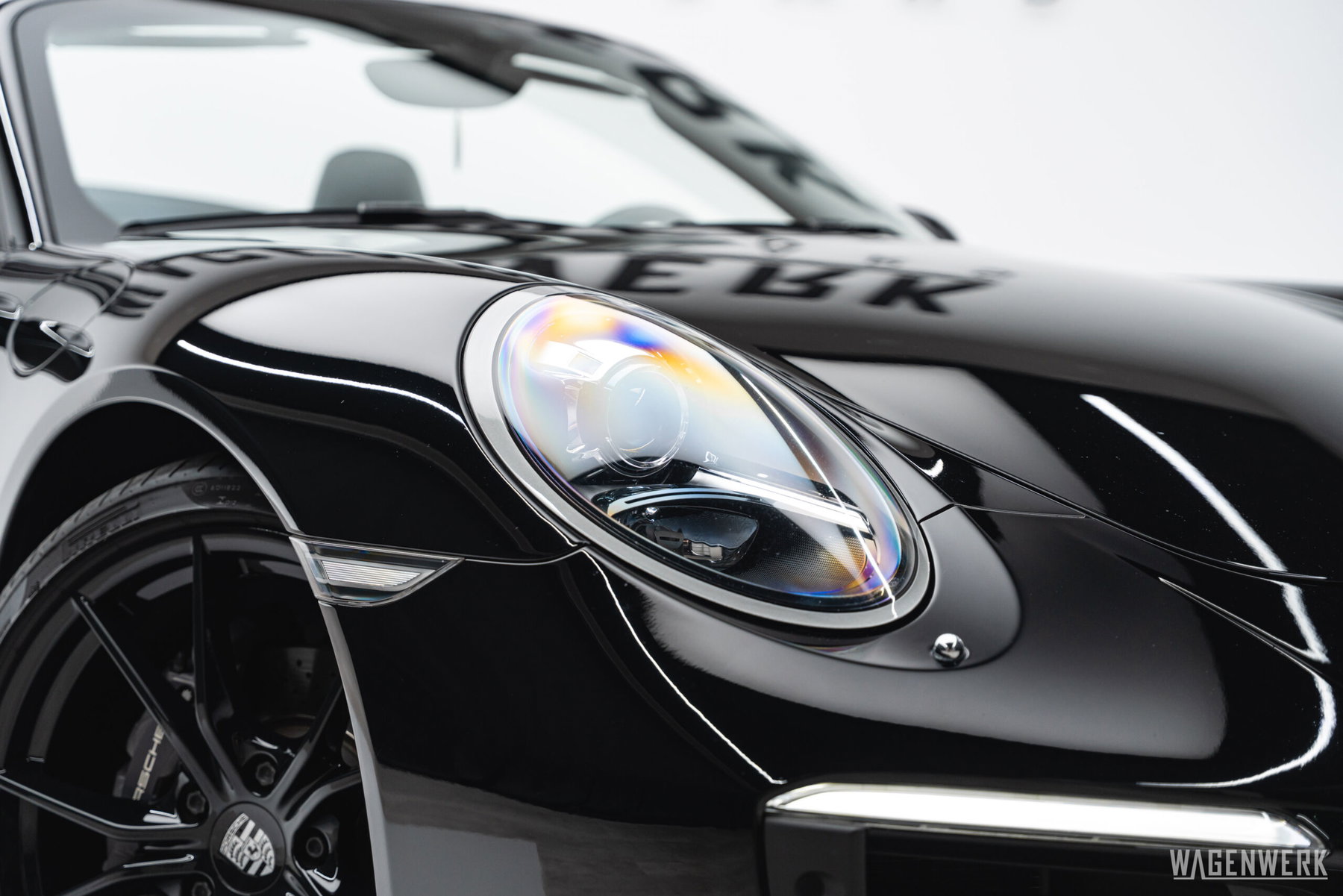 Tout à fait à notre goût, cette 911 se présente en Allblack. Discrète, élégante, mais dotée d’une présence souveraine. La couleur Porsche classique, le noir uni, déploie une profondeur extraordinaire sur les lignes courbes de la 911. Selon l’incidence de la lumière, la peinture semble puissante, presque mystérieuse – une teinte qui souligne parfaitement le langage stylistique intemporel de la 911.