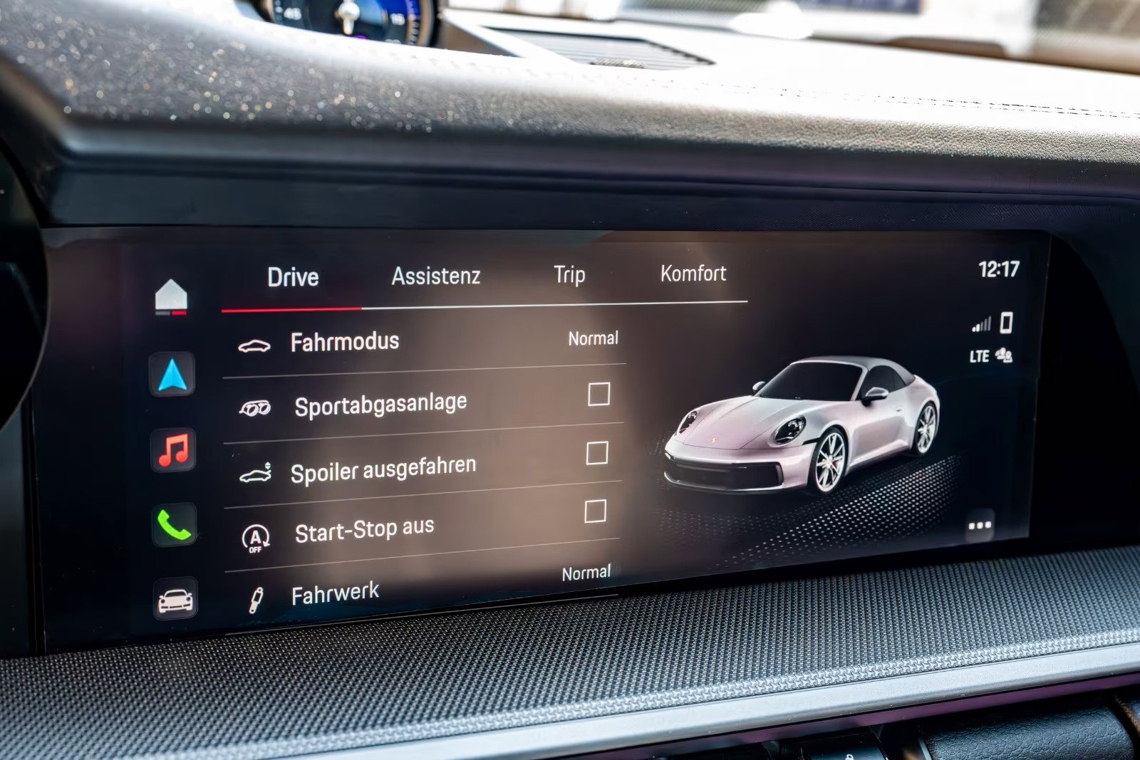Pack rangement, rétroviseurs extérieurs/intérieurs avec anti-éblouissement automatique et capteur de pluie, système d'aide à la conduite : alerte de franchissement de ligne, système d'aide à la conduite : alerte de changement de voie, véhicule sans désignation de modèle, appuie-tête avant avec logo Porsche, réservoir de carburant : 84 l, pack cuir, volant chauffant (GT Sport / cuir) avec fonctions multifonctions et de changement de vitesse, jantes en alliage (noires, finition satinée), jantes en alliage avant/arrière : 8,5×20 / 11,5×21 (jantes Carrera S), peinture métallisée, inscription 911 noire, inscription Porsche peinte, sièges avant ventilés, sièges avant chauffants, système audio BOSE, échappement sport, sorties d'échappement noires, pack Sport Chrono, sièges sport Plus (réglables électriquement, 4 directions)