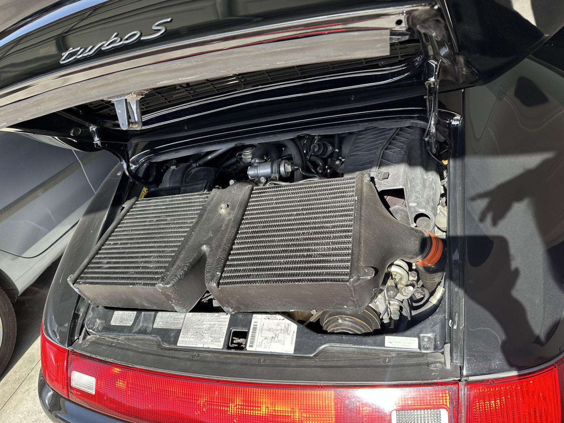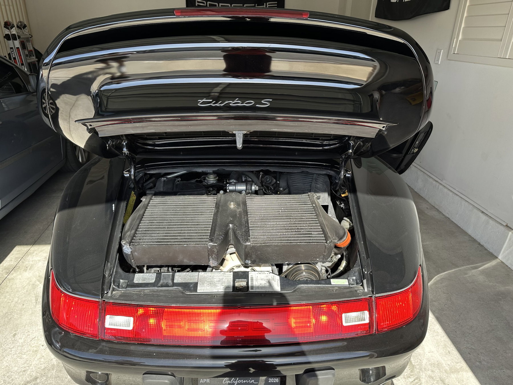 Je mets en vente ma Porsche 993 Cabrio de 1998, de couleur noire avec un intérieur en cuir noir. Sortie de l'usine de Zuffenhausen en version 993 Tiptronic Carrera 2, cette voiture a été entièrement relookée avec des améliorations sportives, notamment un kit aérodynamique Turbo S, des élargisseurs d'ailes arrière, de gros freins Turbo rouges, des sièges sport en fibre de carbone, et bien plus encore. Le moteur d'origine de 3,6 L à double allumage a été remplacé par un moteur de 3,6 L provenant d'une 993 Twin Turbo, puis porté à 3,8 L à allumage unique et couplé à une boîte manuelle à 6 rapports. Des améliorations de la suspension PS10 viennent compléter ce groupe motopropulseur incroyablement amélioré. Sur cette 911, tous les instruments ont été remplacés par des instruments de la 993 Turbo.