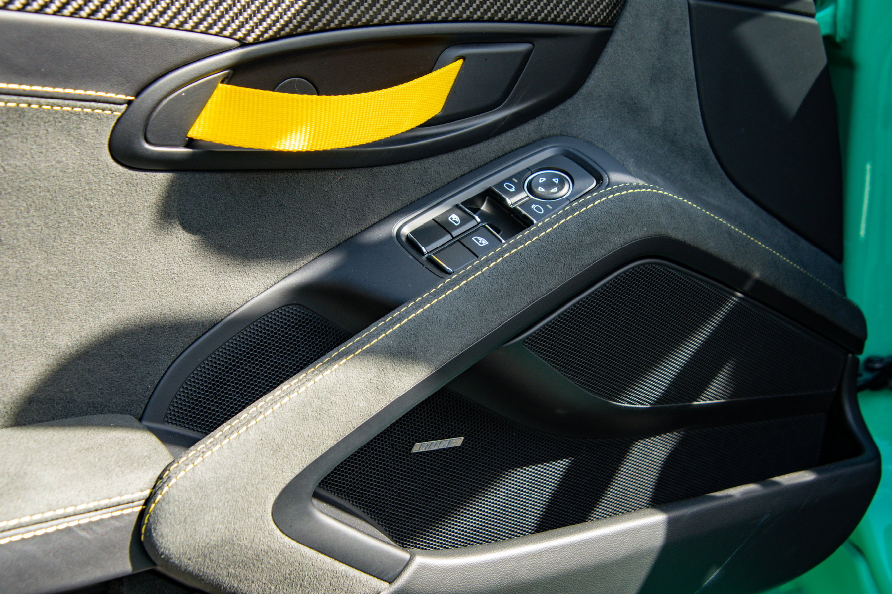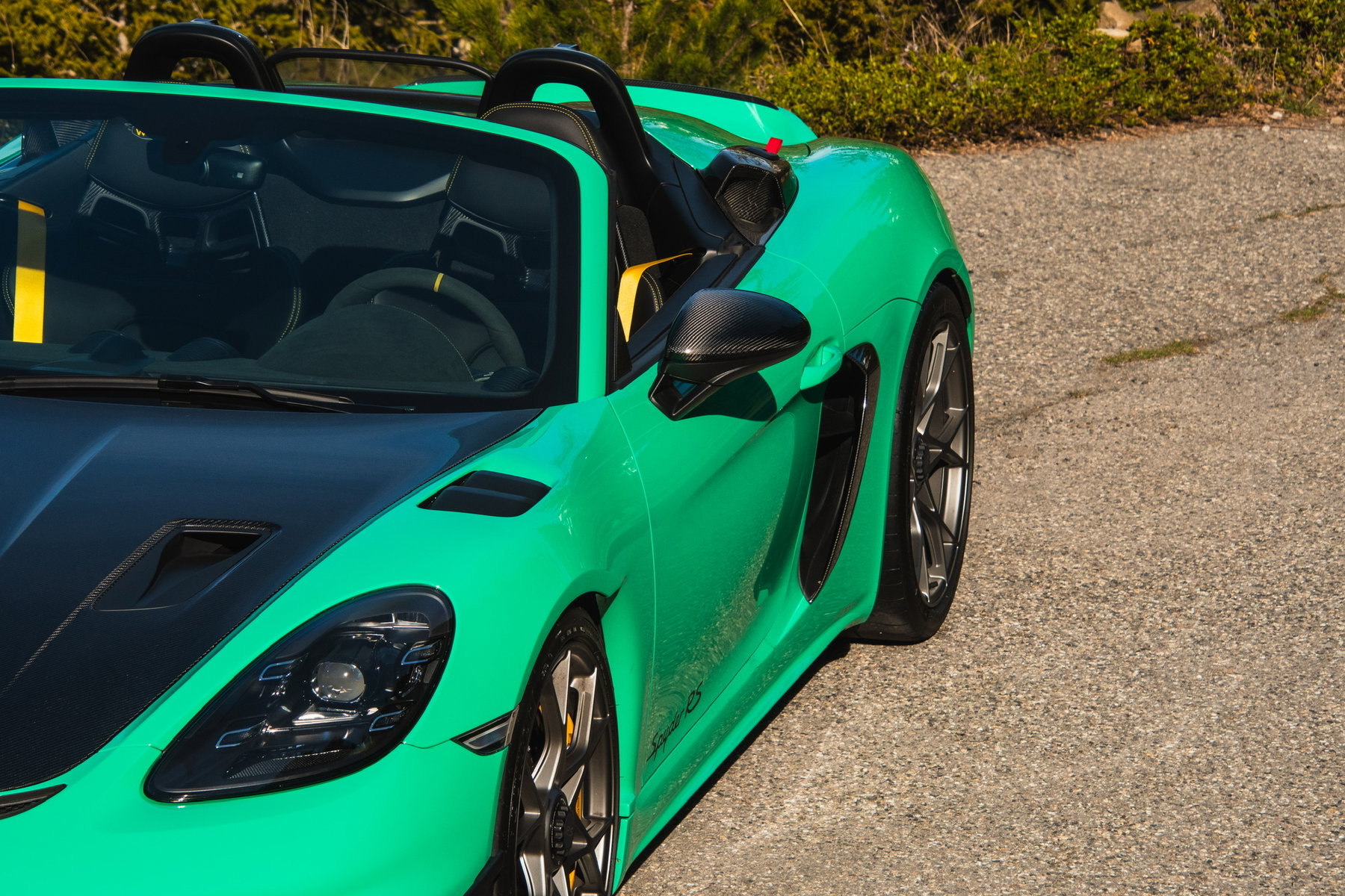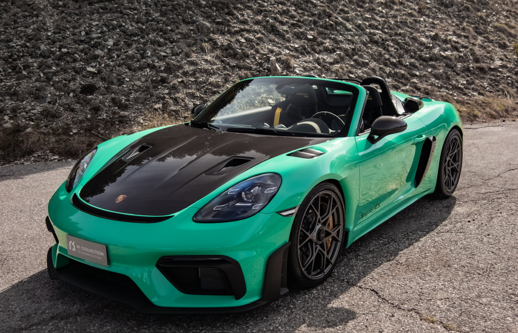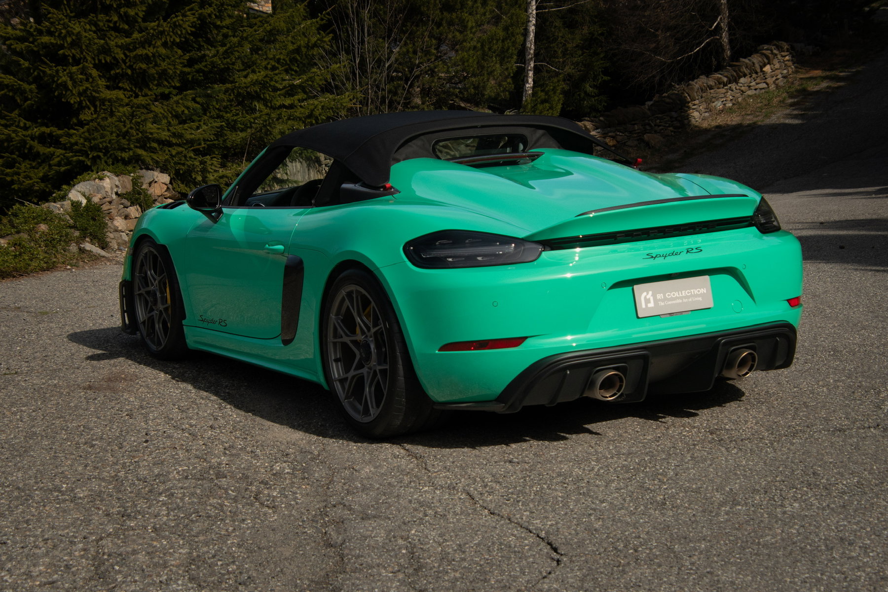 Questa 718 Spyder RS è stata commissionata individualmente tramite Porsche Exclusive Manufaktur ed è un vero e proprio esemplare unico. Rifinita nell'esclusivo colore Paint to Sample „Lighter Green“ — una reinterpretazione moderna dello storico colore Porsche „Jade Green“, formulato appositamente per questa vettura — è abbinata al pacchetto Weissach completo, ai freni Porsche Ceramic Composite Brakes (PCCB) e a interni interamente personalizzati con rivestimenti in pelle estesi, rivestimento del tetto interamente in Race-Tex, finiture in carbonio in tutto l’abitacolo, cinture di sicurezza e maniglie delle portiere in Racing Yellow e un pacchetto completo di cuciture decorative in tutto l’abitacolo. Non esiste nessun altro esemplare con queste specifiche.