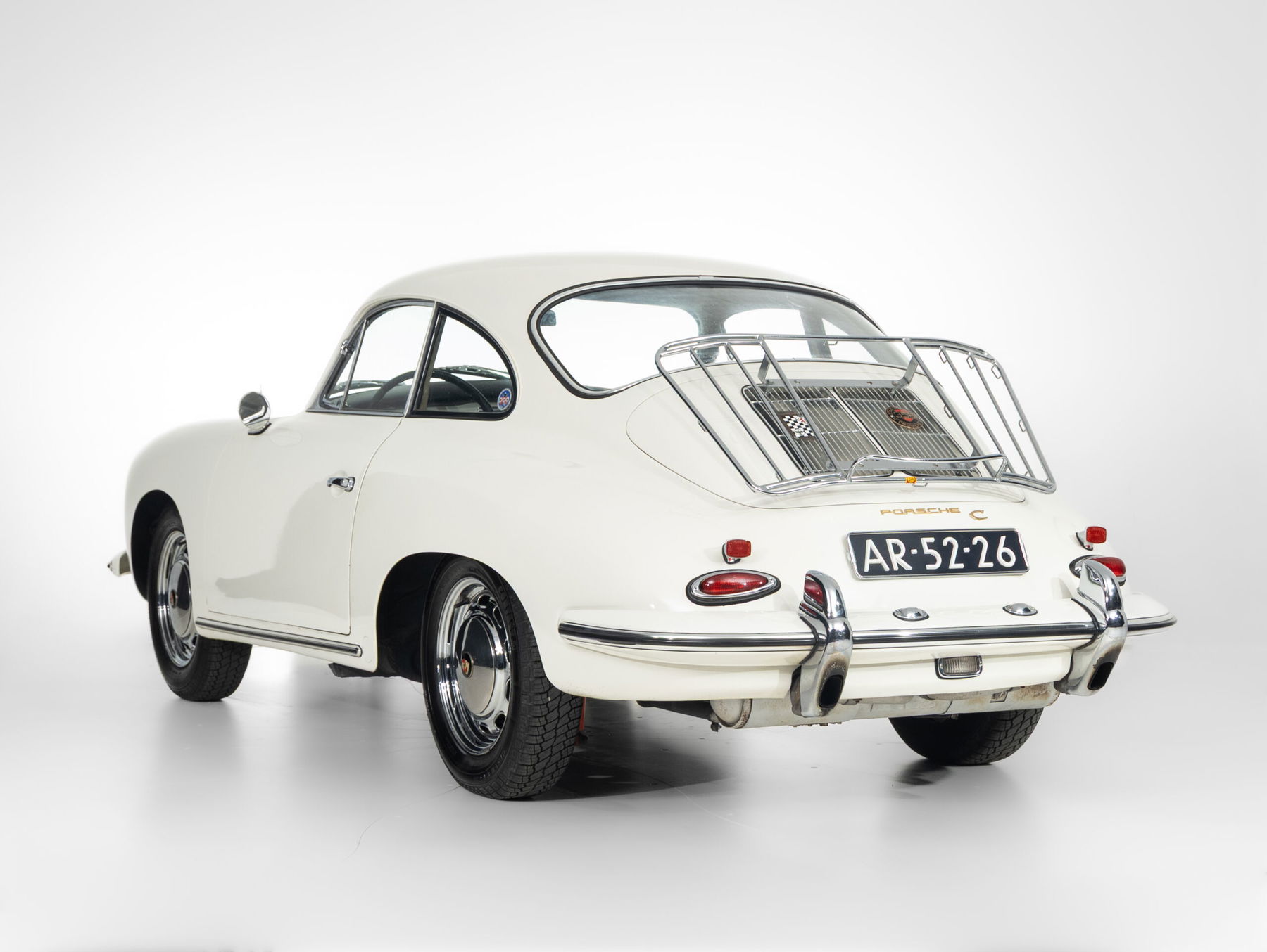 Een zeer originele Porsche 356 C Coupé. Licht ivoorkleurig met een zwart kunstleren interieur. Precies zoals geleverd door de fabriek. Volledige eigendomsgeschiedenis van de eerste eigenaar tot de huidige vierde eigenaar. Het begint met de prachtige aankoopfactuur van de eerste eigenaar uit Beverly Hills, Californië, die de auto met hulp van zijn lokale dealer kocht bij Porsche-importeur D'Ieteren Frères in België. Hij liet de 356 rechtstreeks naar Californië verschepen. De vrachtbrief is nog aanwezig! Dat hij er al trots en zorgvuldig mee omging, blijkt niet alleen uit de aanwezigheid van de originele aankoopfactuur, maar ook uit het originele onderhoudsboekje met handleiding, die nog steeds aanwezig zijn. Een echte zeldzaamheid. Er is ook een prachtige foto uit 1965 waarop de Porsche 356 te zien is als zijn trouwauto.