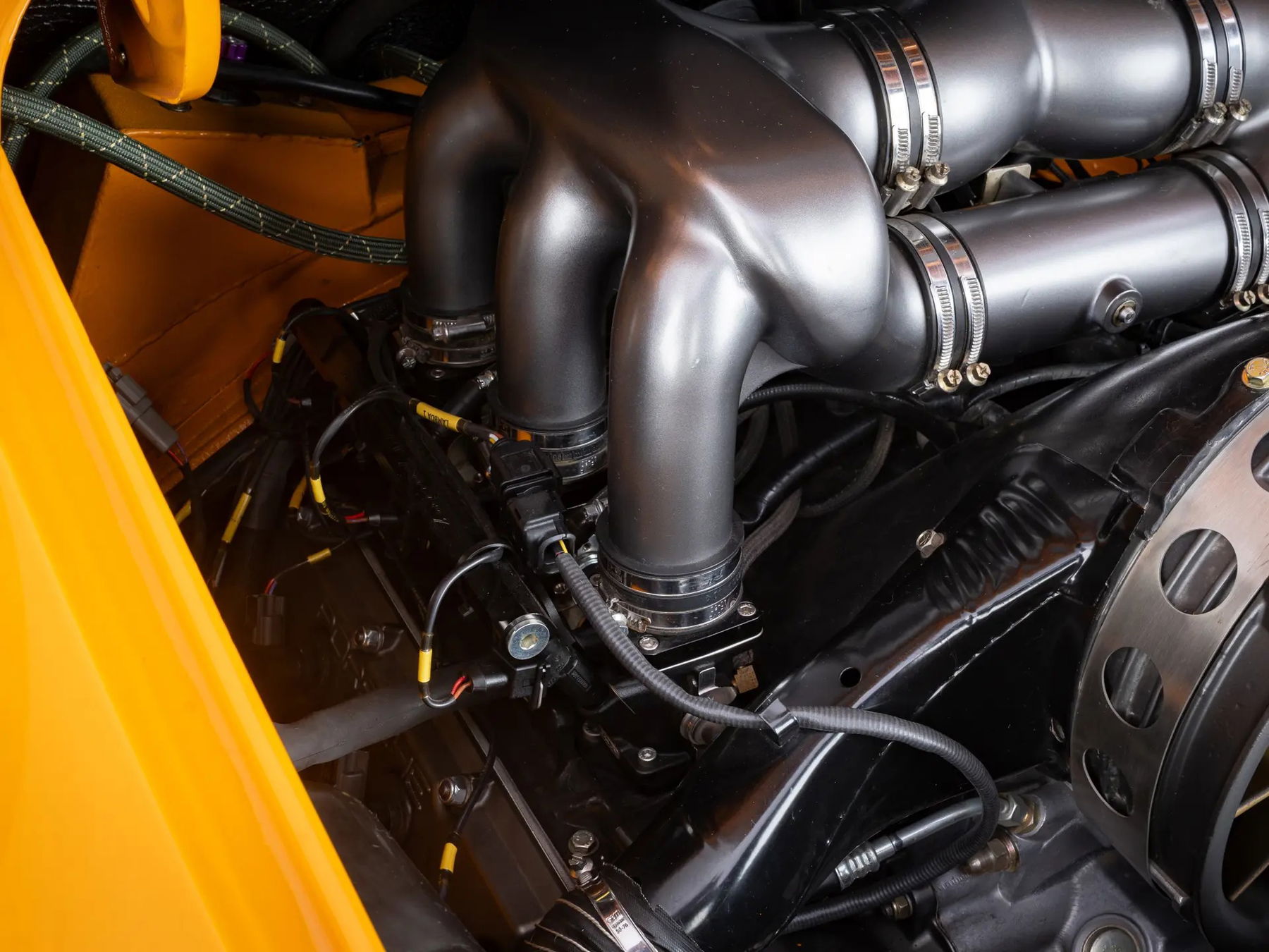 Om te beginnen met het hart van de auto: de 3,2-liter zescilinder boxermotor is gebouwd door Jeff Gamroth van Rothsport en uitgerust met herziene nokkenassen, zuigers met hogere compressie, individuele gasklephuizen en MoTeC-motorregeling. Deze motor levert zoals verwacht een ruim vermogen en een soulvolle motorgeluid bij vol gas. Het vermogen wordt overgebracht via een G50-transmissie die is aangepast door Bill Rader Motorsports en voorzien is van kortere overbrengingsverhoudingen voor de tweede, derde en vierde versnelling. Uiteraard zorgt een sperdifferentieel ervoor dat de achterbanden het vermogen op de weg overbrengen.