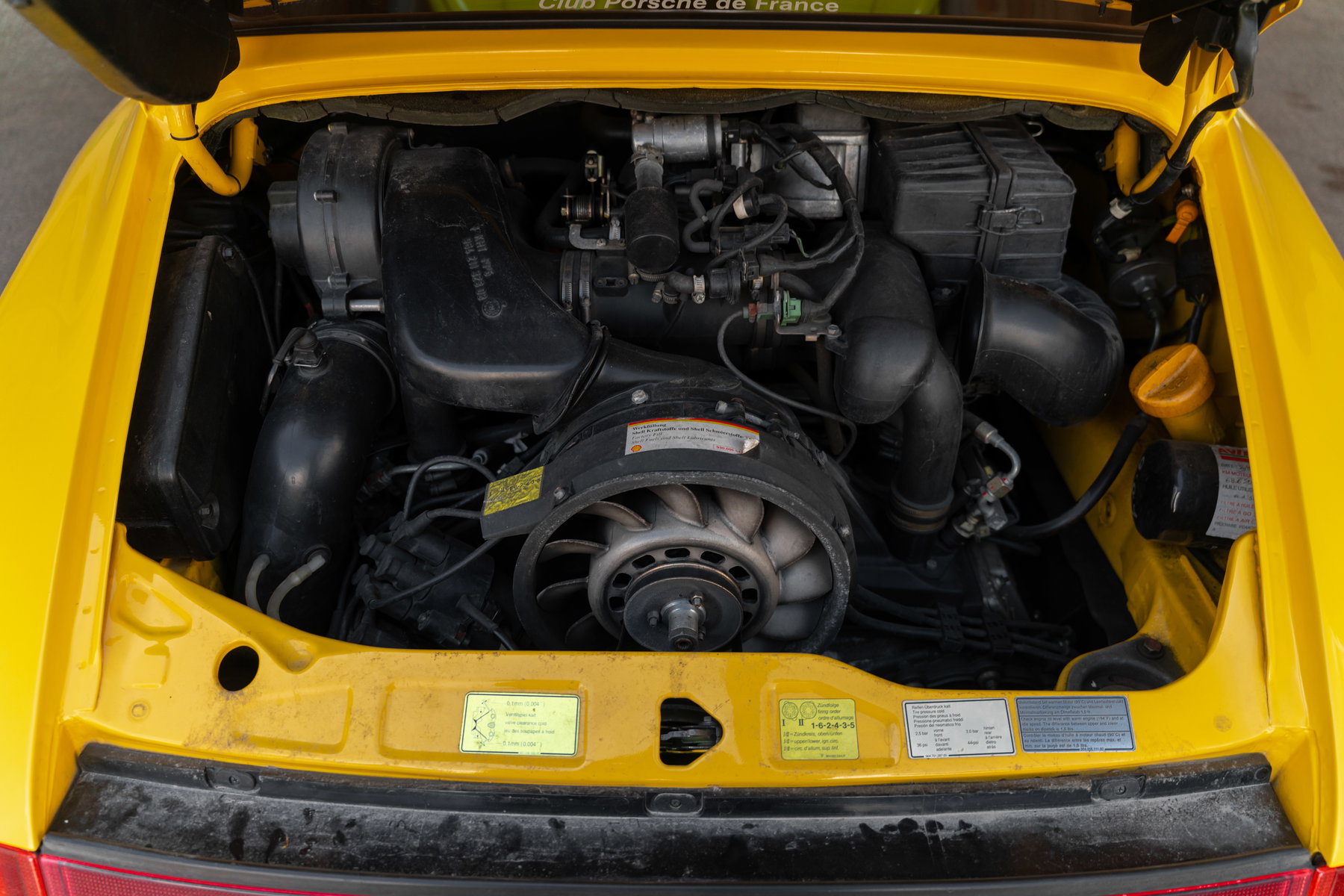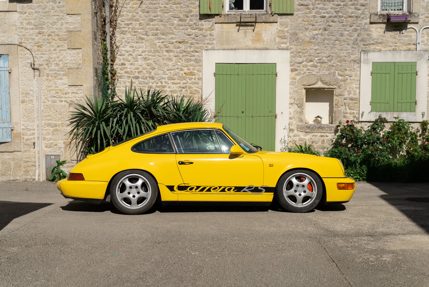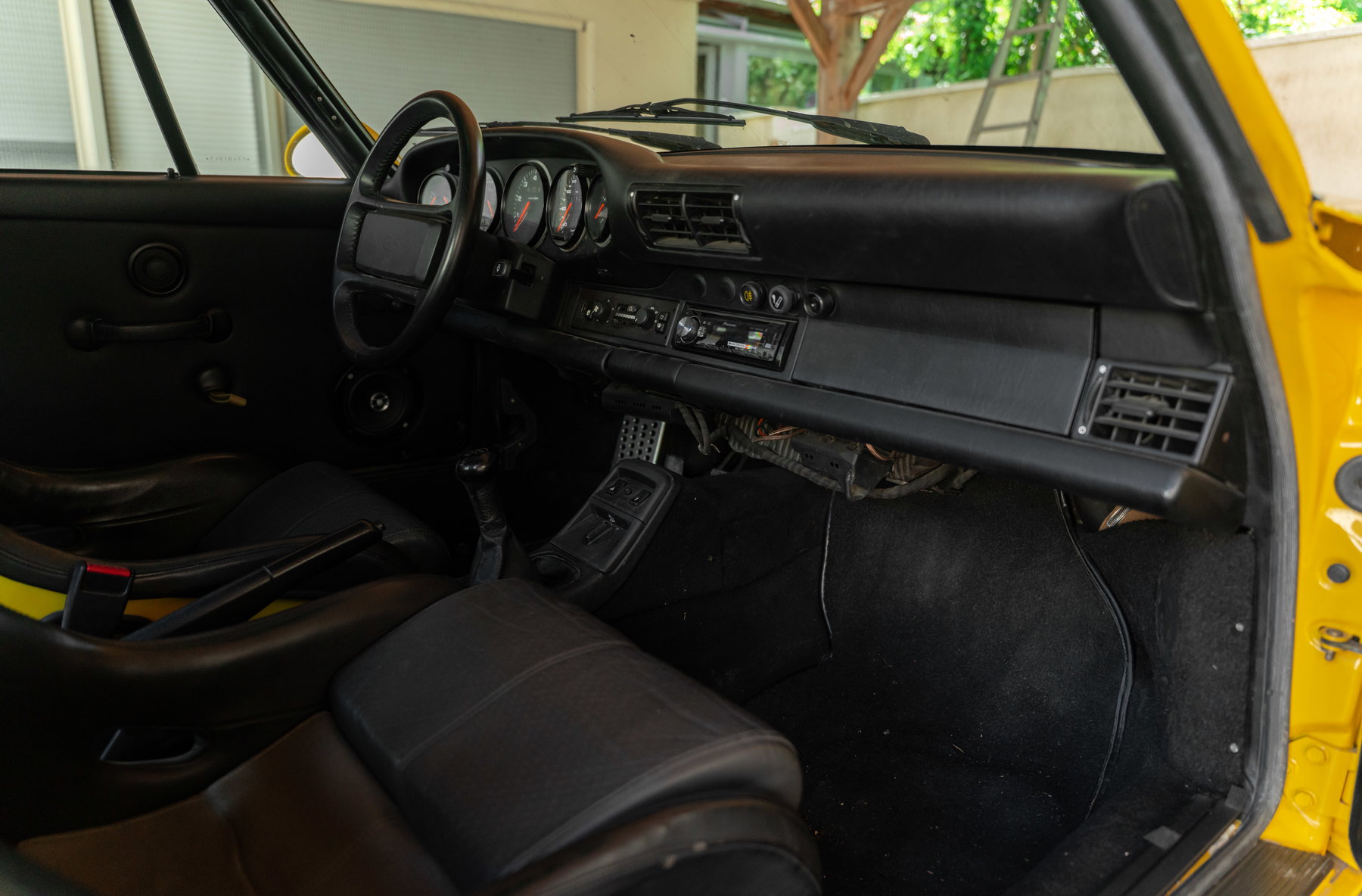 Het exemplaar dat wij u presenteren heeft zijn zeer zeldzame originele kleur behouden, een Jaune Signalisation. De auto beschikt nog steeds over zijn aluminium motorkap en zijn originele magnesium velgen (moeten worden vernieuwd). Onze expertise vermeldt een auto in goede algemene staat met enkele sporen van reparaties en een opnieuw gespoten laklaag. Deze 964 RS vertoont enkele cosmetische gebreken aan de carrosserie.