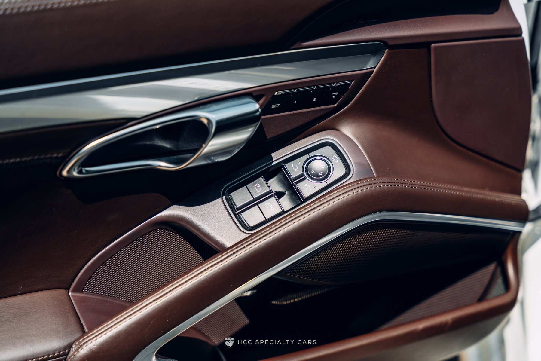 Het interieur is volledig bekleed met natuurlijk leer in de kleur Espresso, dat zich uitstrekt over de stoelen en de oppervlakken in het interieur, en wordt aangevuld met voorzieningen zoals stoelventilatie, verwarmde stoelen en hoofdsteunen met het Porsche-logo.