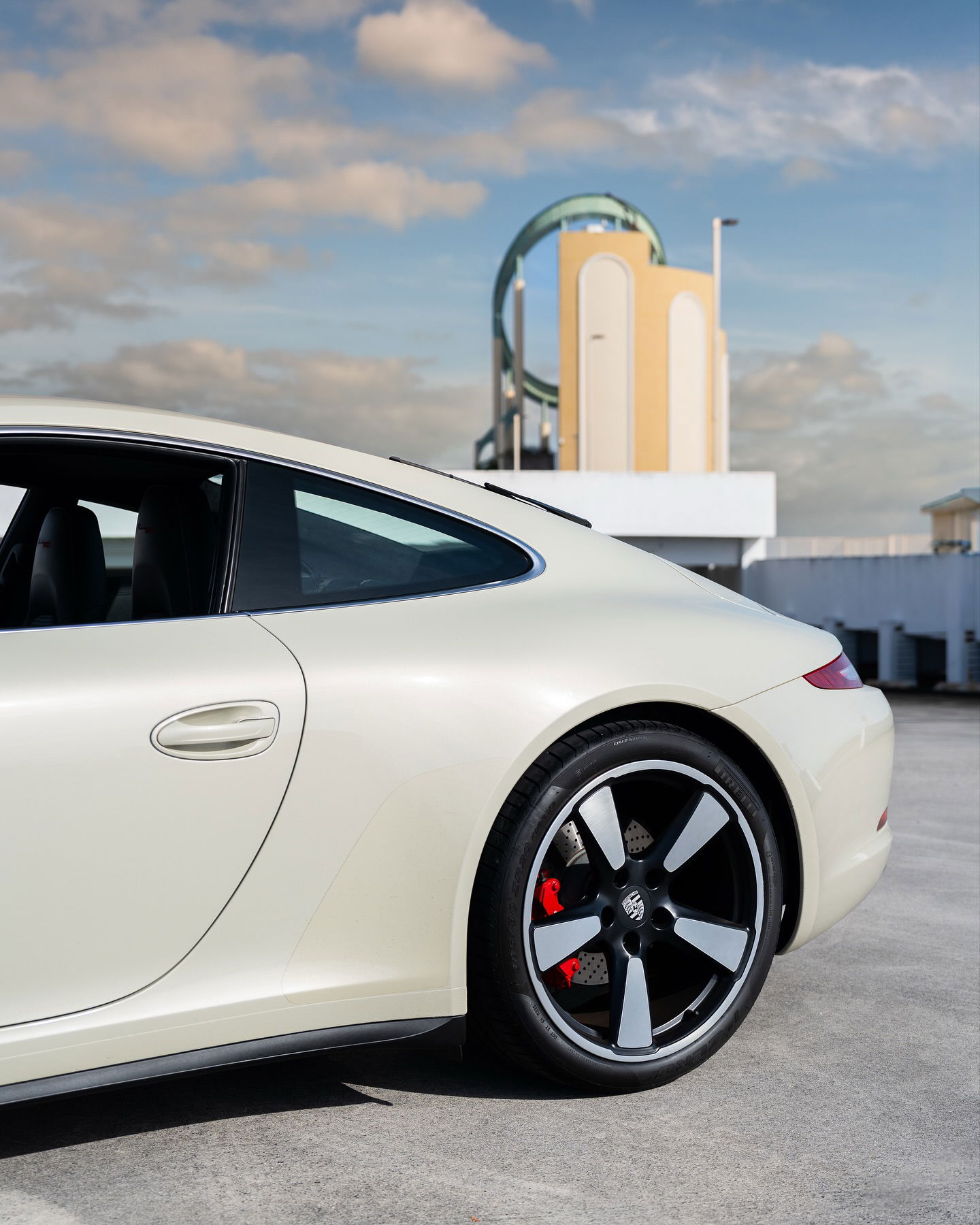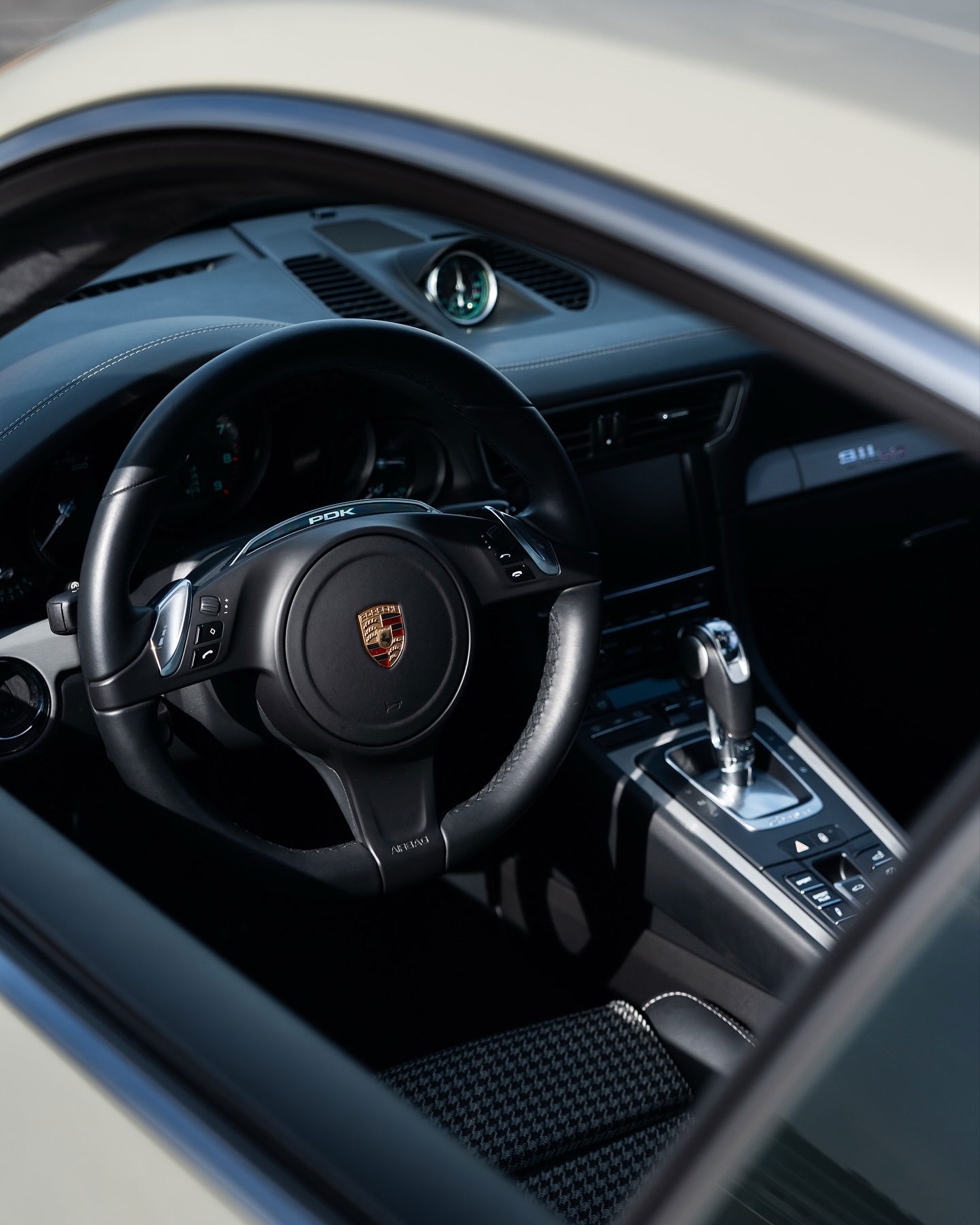 2014 911 50th Anniversary Edition (nummer 0528 van 1974 gebouwde exemplaren) – 4k mijl Het voertuig is voorzien van een volledige lakbeschermingsfolie (PPF). Exterieur: Geyser Grey Metallic Interieur: Klassiek interieur met stoelen in een combinatie van leer en stof, zwart/donker zilver 7-traps PDK-transmissie – afgewerkt in zwart over donker zilver Klassiek interieur met stoelen in een combinatie van leer en stof met Pepita-ruitpatroon. Opties: 250 Porsche Doppelkupplung (PDK) 425 Achterruitwisser 602 LED-koplampen incl. Porsche Dynamic Light System Plus (PDLS Plus) 651 Elektrisch schuif-/kantelbaar schuifdak 658 Power Steering Plus 680 BOSE® Surround Sound System 690 SiriusXM® satellietradio & HD-radio-ontvanger 844 Multifunctioneel stuurwiel UN1 Online Services 27051 0528, beperkingsnummer