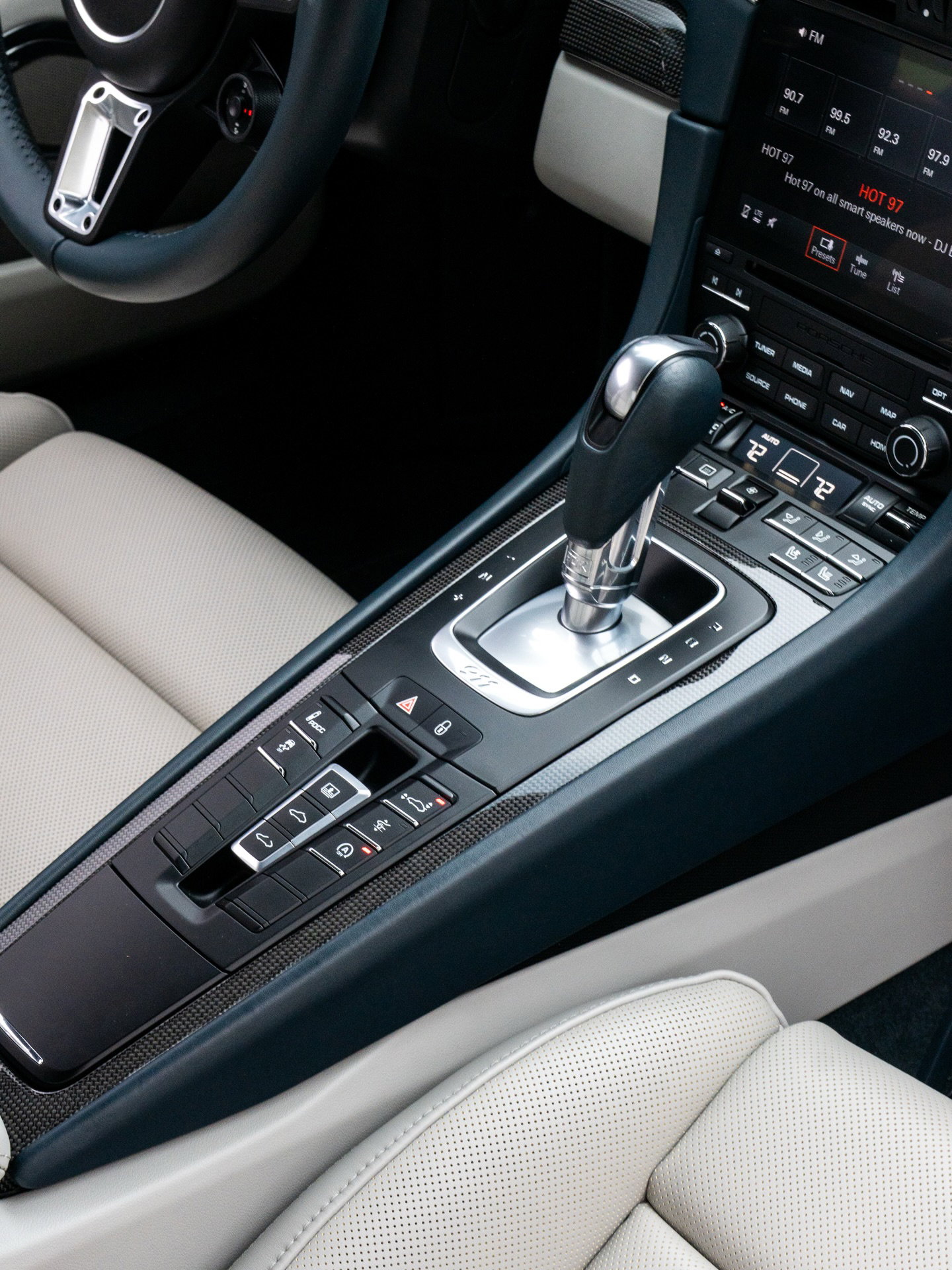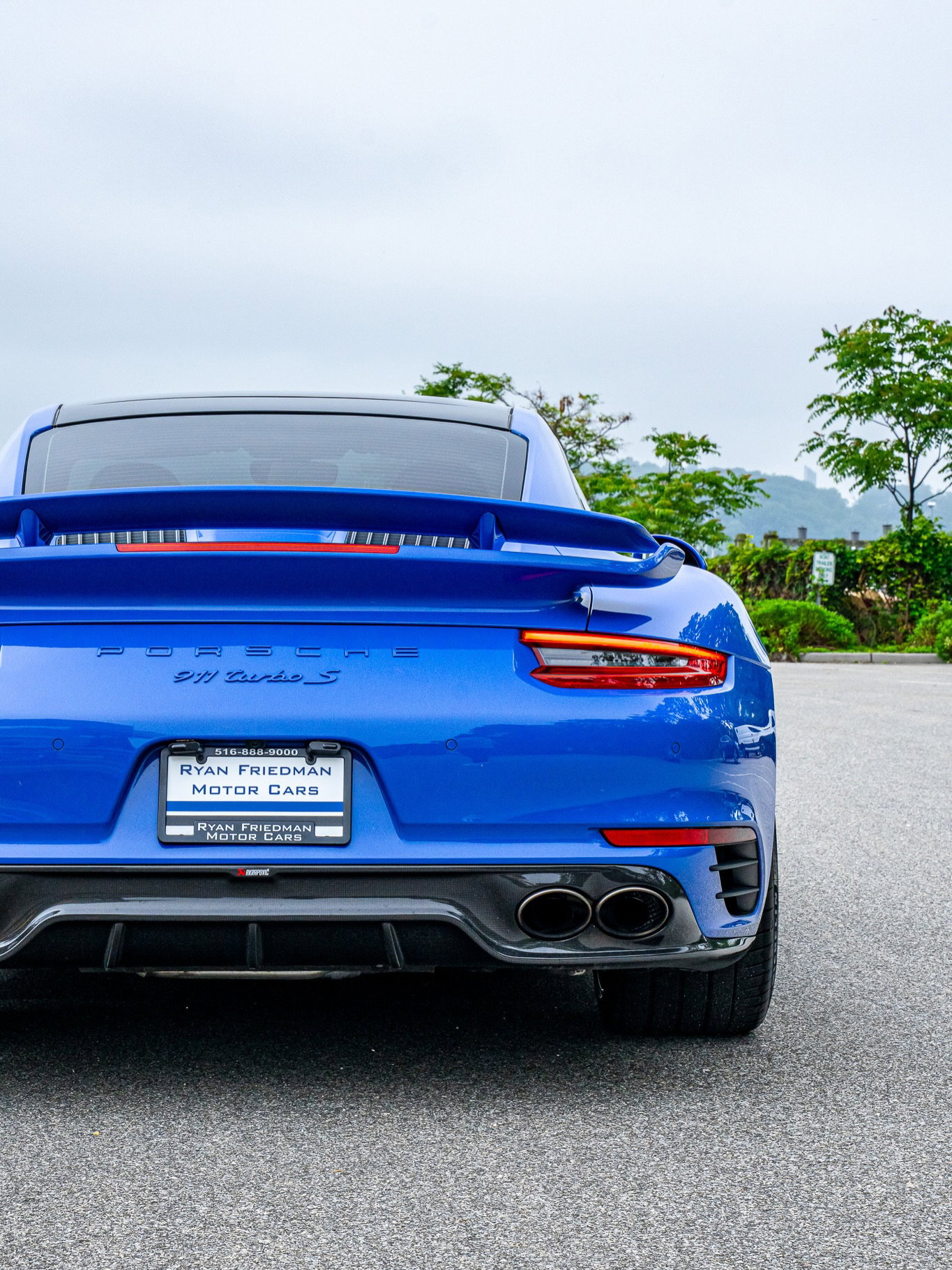 uitgerust met onder andere een aerodynamische aerokit, vooraslift en Burmester-audiosysteem. Een intrigerend en fascinerend exemplaar, afgewerkt in een schitterende niet-metallic lak in de kleur Maritime Blue, een mediumblauwe tint met een subtiele punch, met spiegelbehuizingen afgewerkt met koolstofvezel, zij-airintakes en achterdiffusor, en staat op de bekende 20-inch turbo-wielen met centrale wielmoer, die worden geaccentueerd door de gele remklauwen van het beroemde pccb-systeem. Het interieur is bekleed met modern grafietblauw/krijtgrijs leer en wordt visueel geaccentueerd door racegele instrumenten, krijtgrijze stiksels en veiligheidsgordels, koolstofvezel afwerking op bepaalde plaatsen en een Porsche-embleem in reliëf op de voorste hoofdsteunen. Ongeveer 3.193 exemplaren van de 991.2 Turbo S-variant zijn tijdens de productieperiode van 2017-2019 in Noord-Amerika op de markt gekomen.