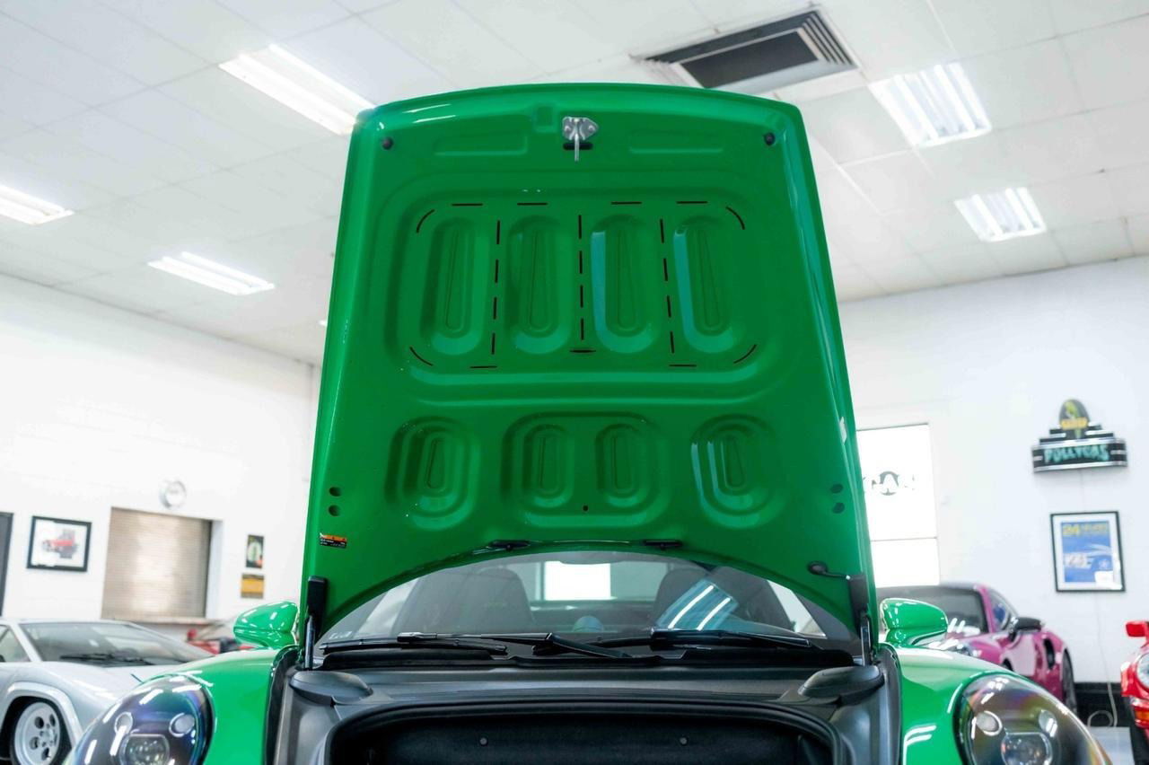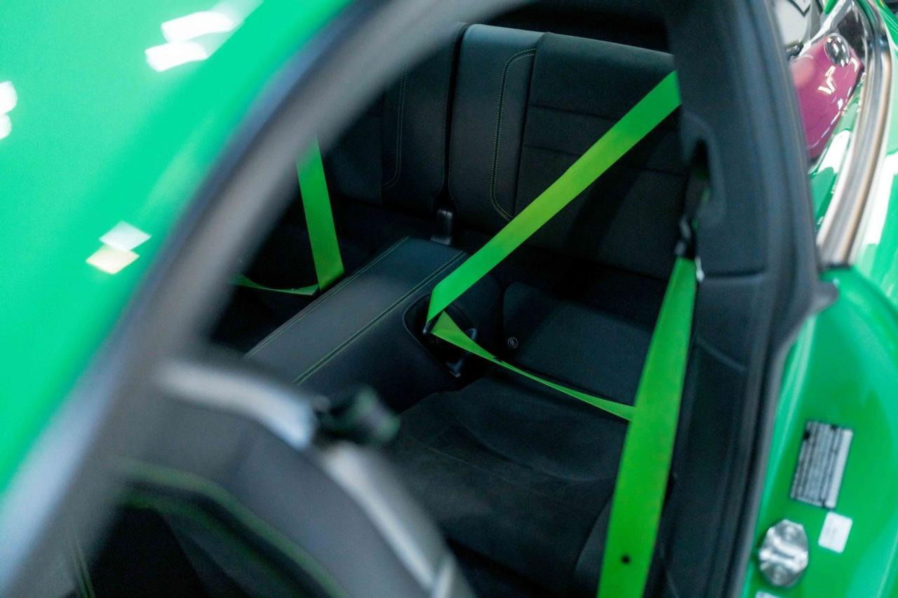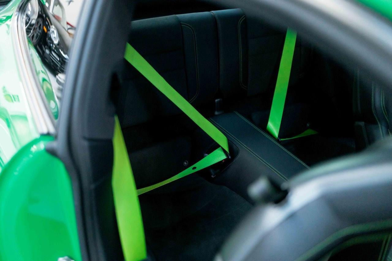 De buitenkant is afgewerkt in python groen over zwart leer/race-tex interieur met afwijkende stiksels in groen.