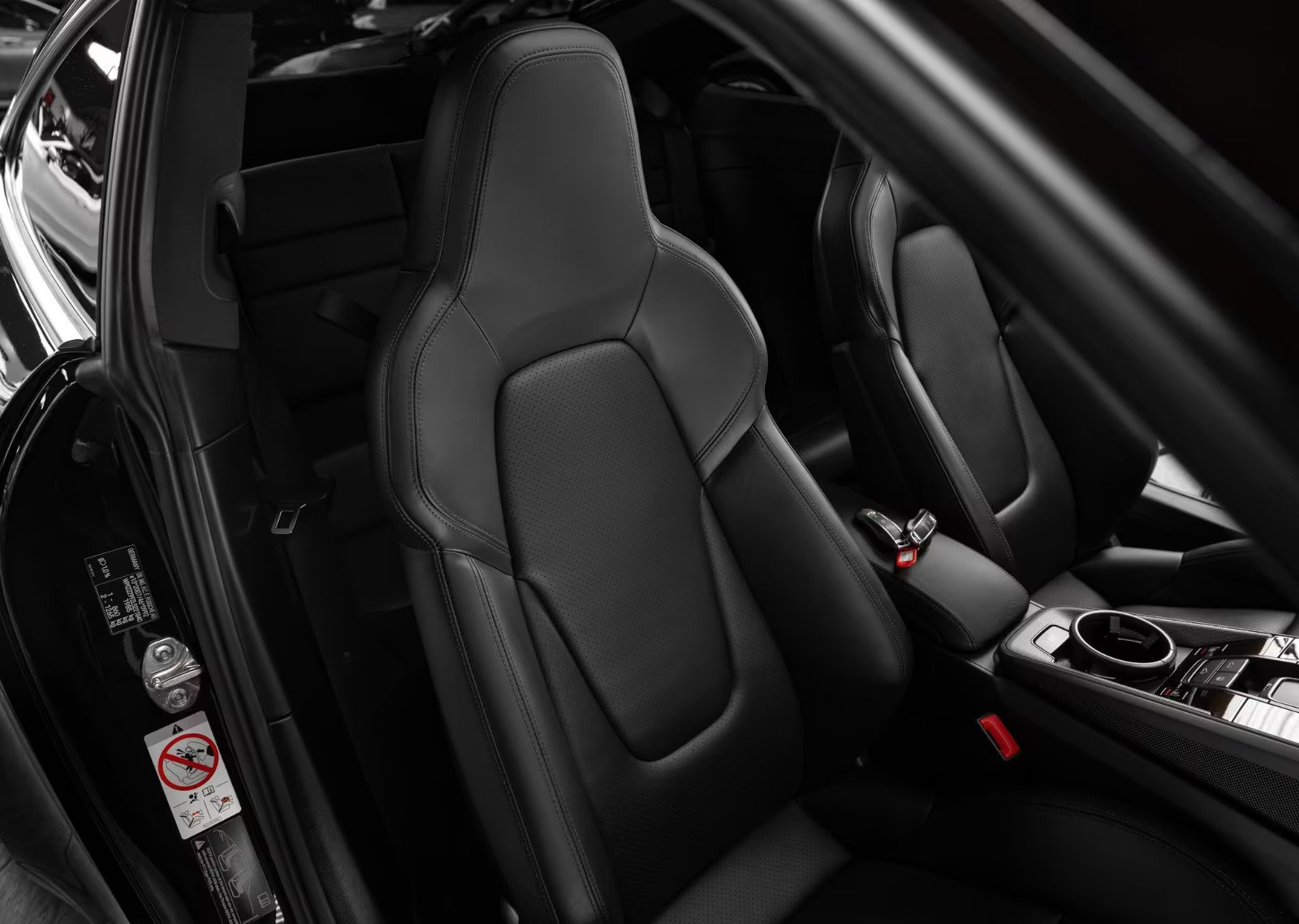 – Zwarte lederen bekleding (glad leer) afgezet met fijne sierstiksels