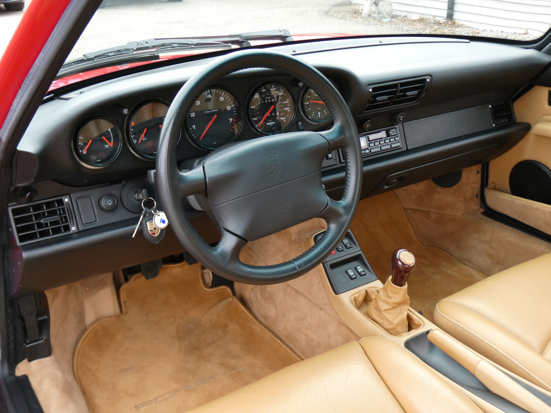 1995 Porsche 993 Carrera 2 coupé, chassisnummer WP0AA2995SS320887, Guards Red met kasjmier gedeeltelijk leder, 3,6 liter luchtgekoelde zescilinder boxermotor met 272 pk en 243 lb-ft koppel, hangeschakelde zesversnellingsbak, antiblokkeerremmen op alle vier de wielen, 2+2 zitplaatsen, fabrieksoptie: elektrisch bedienbaar stalen schuifdak, volledig elektrisch verstelbare bestuurdersstoel, sperdifferentieel, 17 inch Cup lichtmetalen velgen, donkere rootwood versnellingspookknop, compleet met originele gebruikershandleidingen en origineel onderhoudsboekje, originele raamsticker, nieuw geleverd op 14 mei 1994 via Price Motorcars Porsche in Wilmington, Delaware, ultralaag kilometrage, in uitzonderlijke staat, en afkomstig uit de laatste generatie van de luchtgekoelde 911-productie.