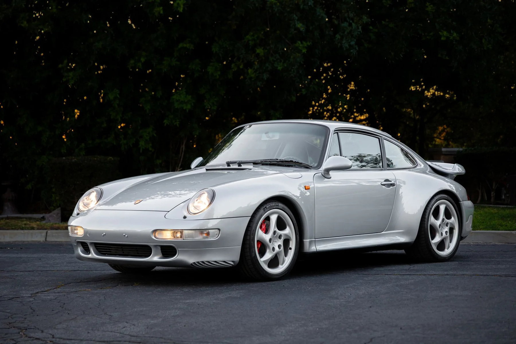 De 993 Turbo had een bredere carrosserie, herziene bumperbekleding en een vaste achterspoiler om plaats te bieden aan top-mount intercoolers in vergelijking met de standaard 993 coupé. Dit exemplaar is uitgevoerd in Polar Silver Metallic (92M) en werd besteld zonder zonnedak. Extra details zijn onder meer geïntegreerde mistlampen, een achterruitwisser en gepolijste uitlaatpijpen. Er zijn lakschade te zien op de motorkap en de rechterkant van de achterspoiler.