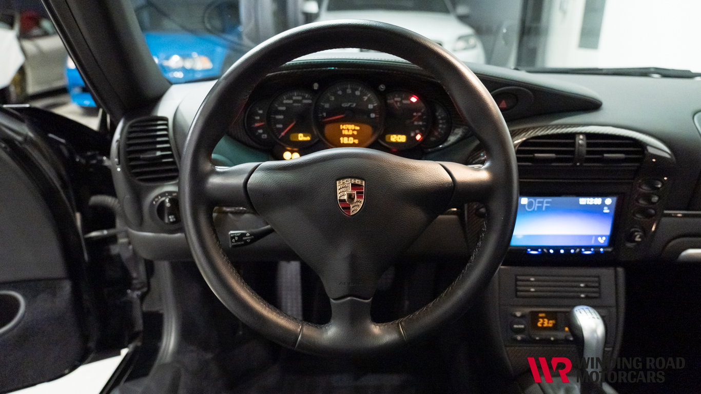 Prachtige Porsche 911 GT3 uit 2005 met lage kilometerstand, uitgevoerd in zwart met een zwart interieur, met iets minder dan 15.000 km op de teller sinds de eerste registratie. Deze 996.2 GT3 met handgeschakelde zesversnellingsbak is uitgerust met de legendarische 3,6-liter Mezger-boxermotor en biedt een pure, analoge rijervaring die steeds moeilijker te vinden is, zeker met zo'n lage kilometerstand en in deze staat.