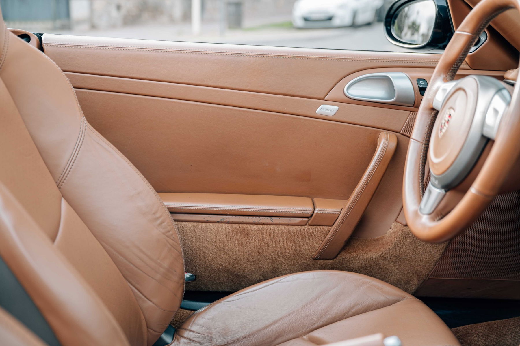 Het sublieme beige Sable lederen interieur is in zeer goede staat, zoals te zien is op de foto's. Het leer is zeer zeldzaam in deze heldere kleur, strak en schoon, waardoor deze sportieve cabriolet een echt luxueuze uitstraling heeft. Het stuur, de stoelen en de middenconsole zijn allemaal uitstekend bewaard gebleven. Er zijn slechts enkele lichte krasjes op de rechterstoel.